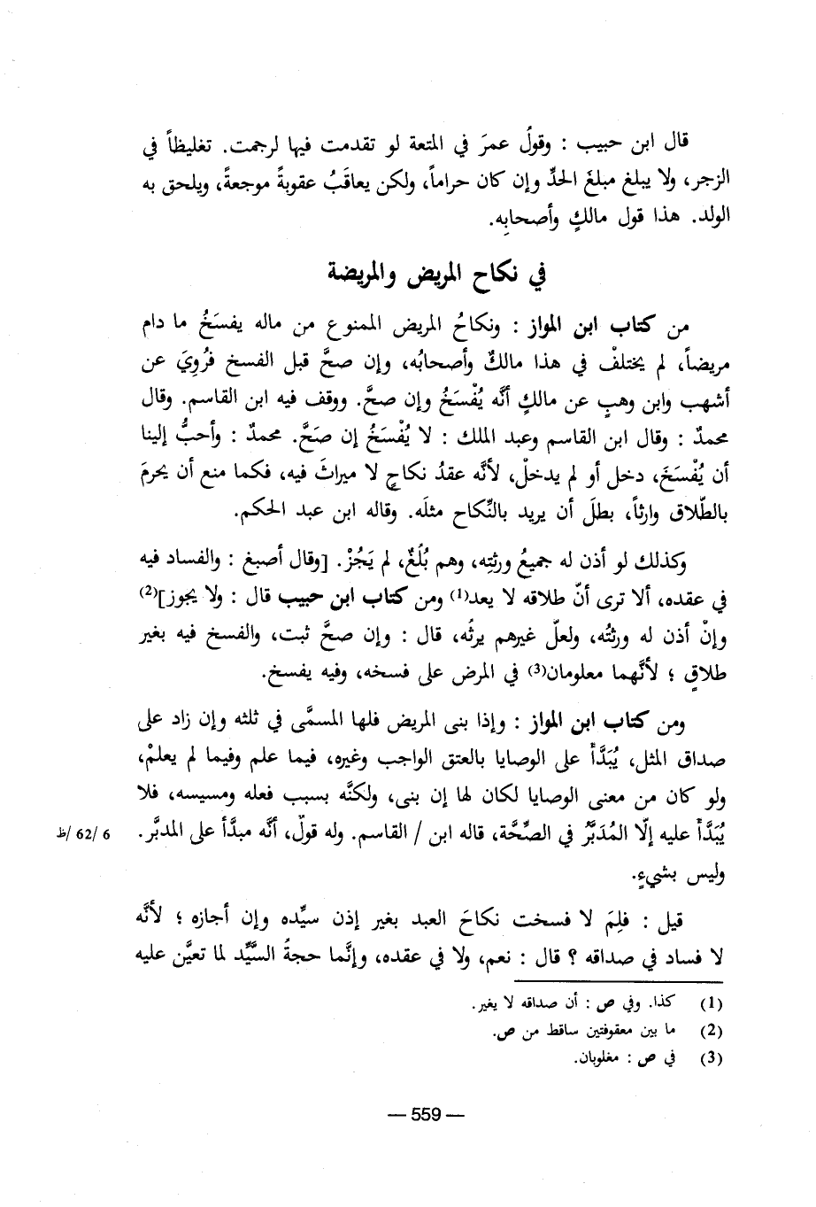 من كتاب ابن المواز: ونكاح المريض المنوع من ماله يفسخ ما دام مريضاً لم يحتلف في هذا مالك واصحابه، وإن صح قبل الفسخ فروي عن اشهب وابن وهب عن مالك انه يفسخ وان صح. ووقف فيه ابن القاسم. وقال محمد: وقال ابن القاسم وعبد الملك: لايفسخ أن صح. محمد: واحب الينا ان يفسخ، دخل اولم يدخل، لانه عقد نكاج لاميراث فيه، فكما منع ان يحرم بالطلاق وارثاً، بطل ان يريد بالنكاح مثله. وقاله ابن عبد الحكم.