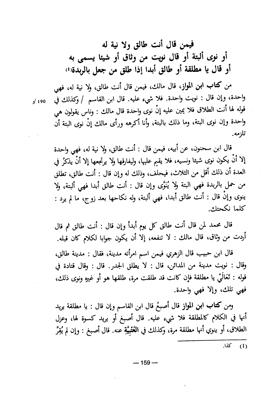 قال محمد لمن قال أنت طالق كل يوم أبدا وإن قال: أنت طالق ثم قال أردت من وثاق، قال مالك: لا تنفعه، إلا أن يكون جوابا لكلام كان قبله.