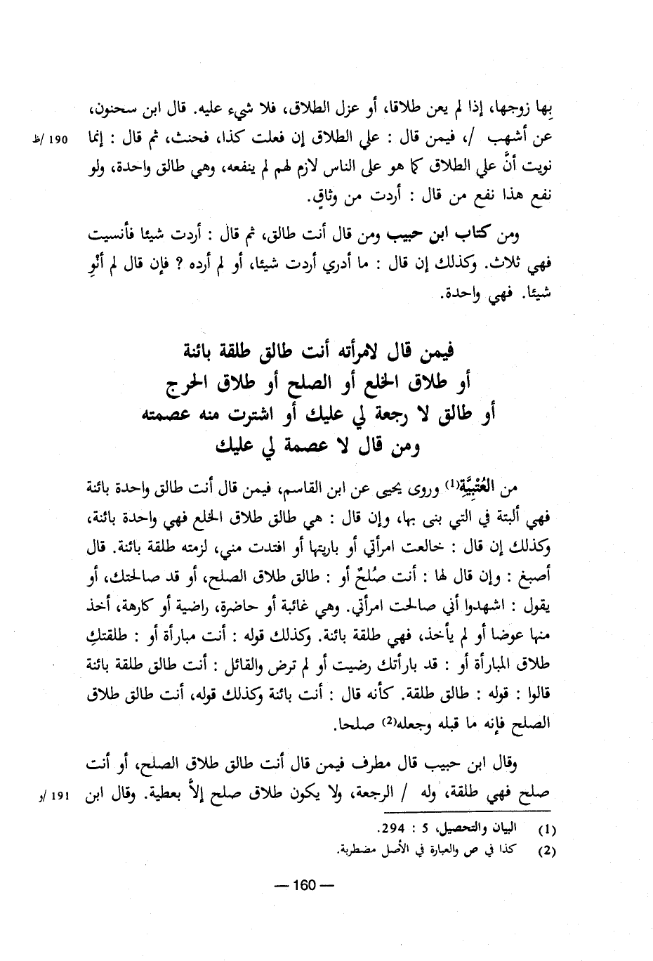 وقال ابن حبيب قال مطرف فيمن قال أنت طالق طلاق الصلح، أو أنت صلح فهي طلقة، وله / الرجعة، ولا يكون طلاق صلح إلا بعطية. وقال ابن [5/ 160]