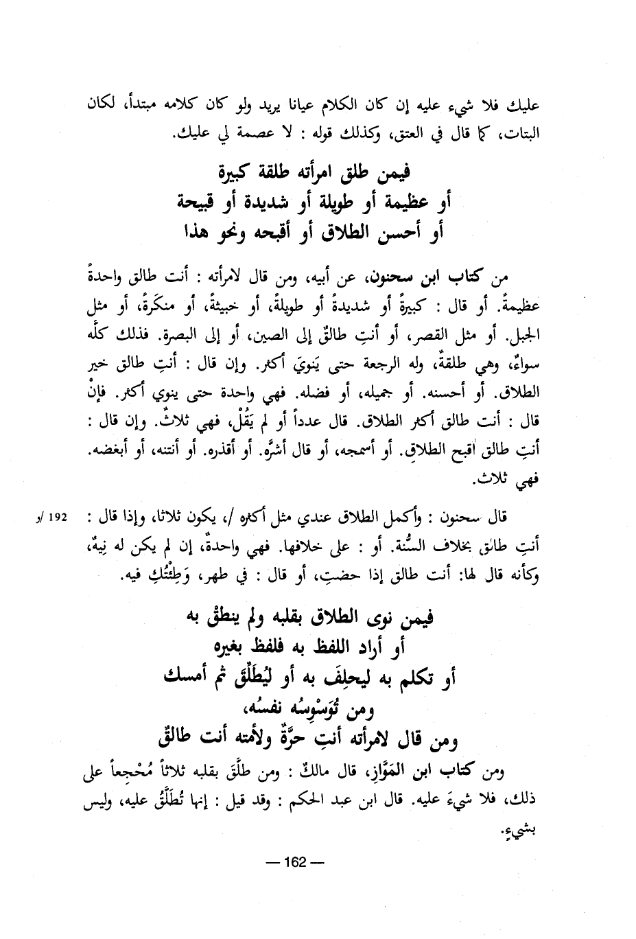 ومن كتاب ابن المواز، قال مالك: ومن طلق بقلبه ثلاثا محجعا على ذلك، فلا شيء عليه. قال ابن عبدالحكم: وقد قيل: إنها تطلق عليه، وليي بشيء. [5/ 162]