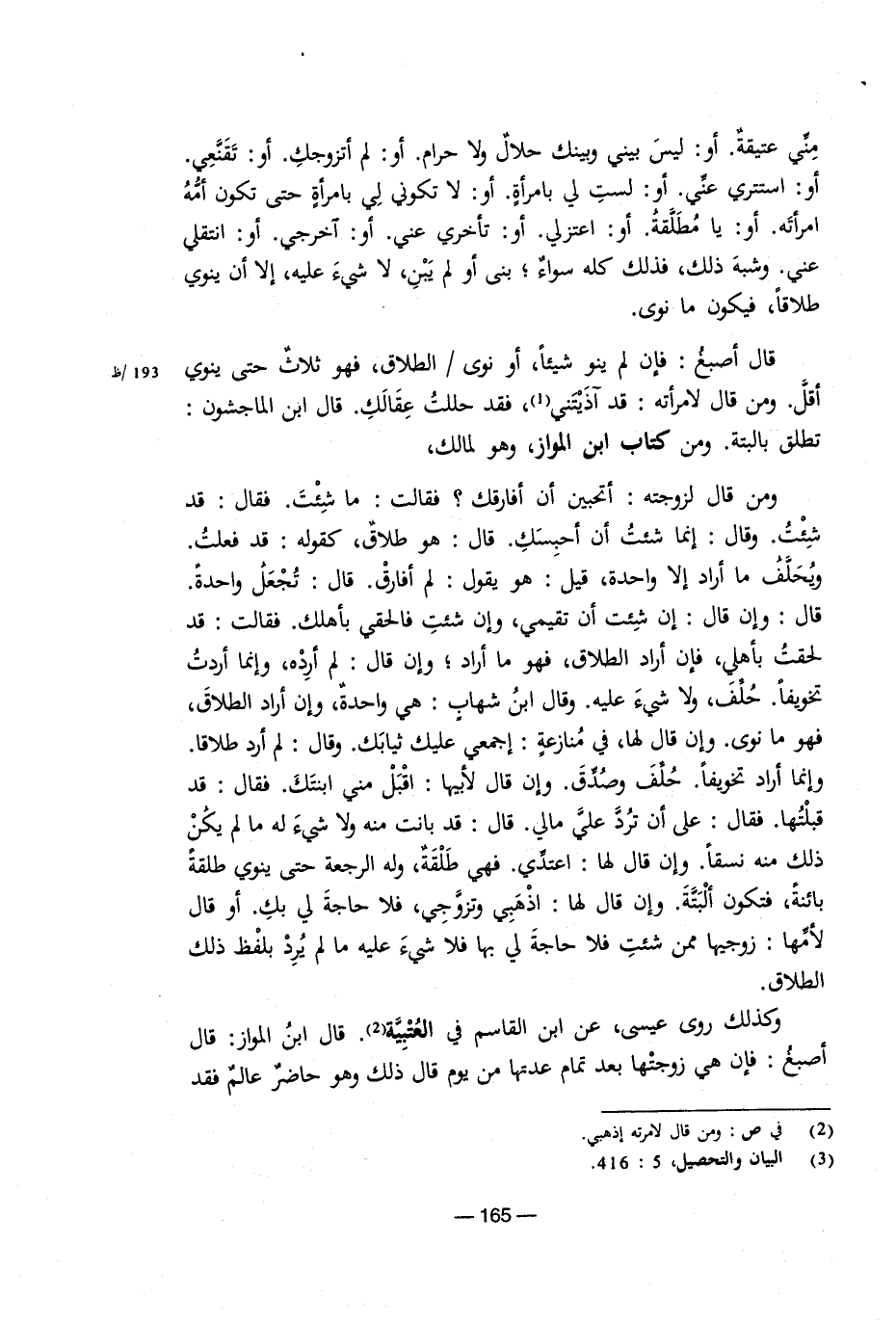 قال أصبغ: فإن لم ينو شيئا، أو نوى / الطلاق، فهو ثلاث حتى ينوي أقل. ومن قال لامرأته: قد أذيتني، فقد حللت عقالك. قال ابن الماجشون: تطلق بالبتة. ومن كتاب ابن المواز، وهو لمالك،