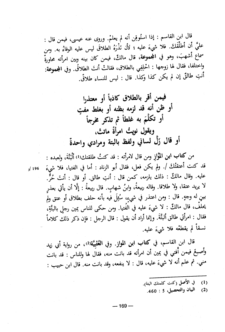 من كتاب ابن المواز ومن قال لامرأته: قد كنت طلقتك ألبتة، ولعبده: قد كنت أعتقتك/. ولم يكن فعل، فقال أبو الزناد: أما في الفتيا، فلا شيء عليه. وقال مالك: ذلك يلزمه، كمن قال: أنت طالق. أو قال: أنت حر. لا يريد عتقا، ولا طلاقا. وقاله ربيعة، وابن شهاب. قال ربيعة: إلا أن يأتي بعذر بين له وجه. قال: ومن اعتذر في شيء، سئل فيه بأنه حلف بطلاف أو عتق ولم يحلف، قال مالك: لا شيء عليه في الفتيا. ومن حكى للناس يمين رجل بالبتة، فقال: امرأتي طالق آلبتة. وإنما أراد أن يقول: قال الرجل: فإن ذكر ذلك كلاما نسقا لم يقطعه فلا شيء عليه.