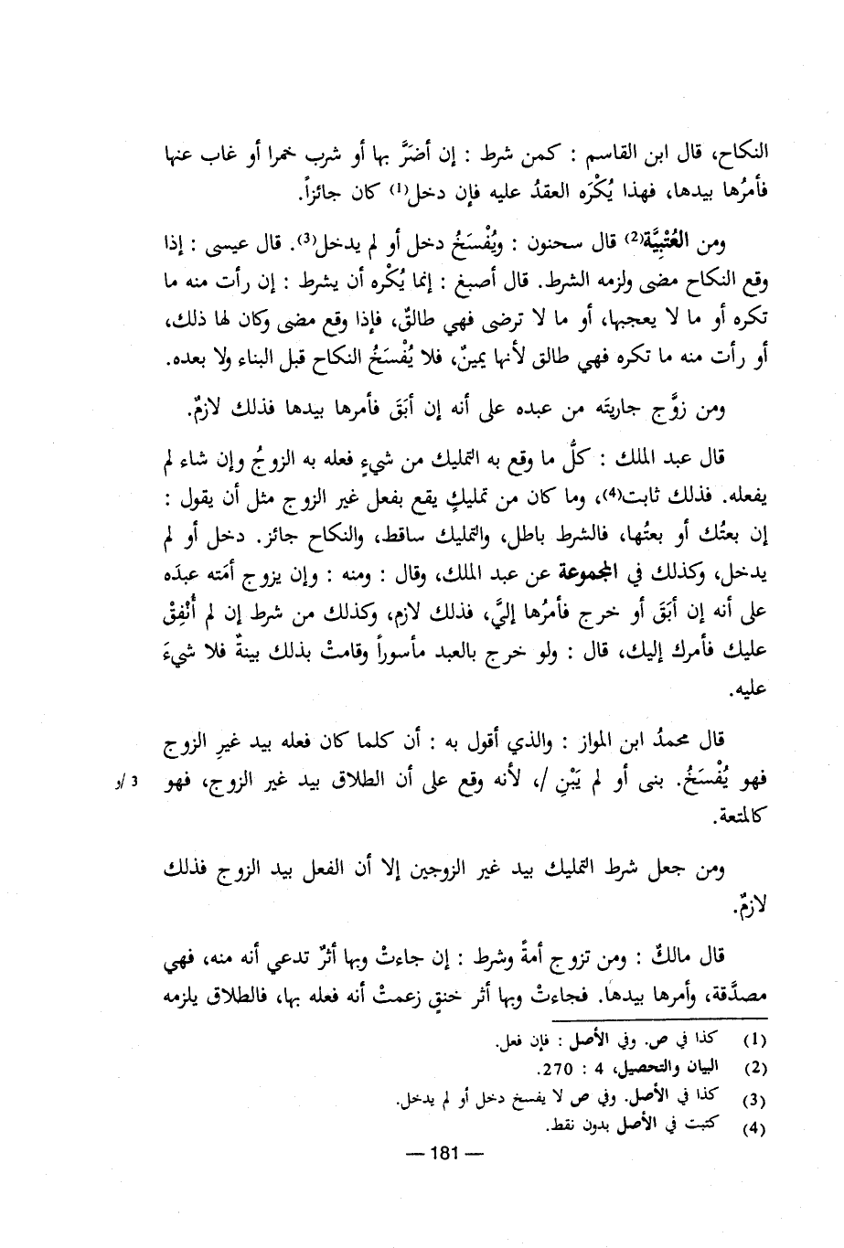 قال عبدالملك: كل ما وقع به التمليك من شيء فعله به الزوج وإن شاء لم يفعله. فذلك ثابت، وما كان من تمليك يقع بفعل غيرالزوج مثل أن يقول: إن بعتك أو بعتها، فالشرط باطل، والتمليك ساقط، والنكاح جائز. دخل أو لم يدخل، وكذلك في المجموعة عن عبدالملك، وقال: ومنه: وإن يزوج أمته عبده على أنه إن أب أو خرج فأمرها إلي، فذلك لازم، وكذلك من شرط إن لم أنفق عليك فأمرك إليك، قال: ولو خرج بالعبد مأسورا وقامت بذلك بينة فلا شيء عليه.