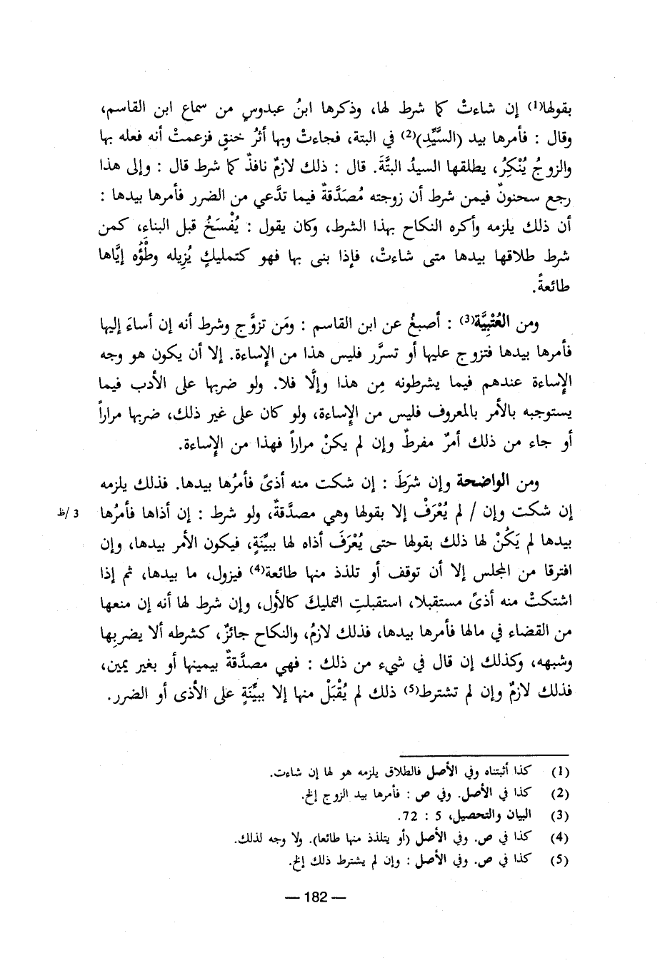 بقولها إن شاءت كما شرط لها، وذكرها ابن عبدوس من سماع ابن القاسم، وقال: فأمرها بيد (السيد) في البتة، فجاءت وبها أثر خنق فزعمت أنه فعله بها والزوج ينكر، يطلقها السيد البتة. قال: ذلك لازم نافذ كما شرط قال: وإلى هذا رجع سحنون فيمن شرط أن زوجته مصدقة فيما تدعي من الضرر فأمرها بيدها: أن ذلك يلزمه وأكره النكاح بهذا الشرط، وكان يقول: يفسخ قبل البناء، كمن شرط طلاقها بيدها متى شاءت، فإذا بنى بها فهو كتمليك يزيله وطؤه إياها طائعة.