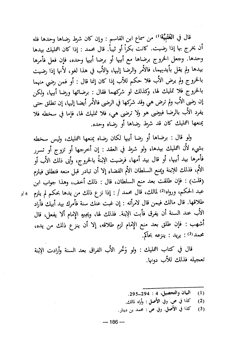 ولو قال: برضاها أو رضا أبيها لكان رضاه يمنعها التمليك، وليس سخطه بشيء لأن التمليك بيدها، ولو شرط في العقد: إن أخرجها أو تزوج أو تسرر فأمرها بيد أبيها، أو قال بيد أمها، فرضيت الابنة بالخروج، وأبى ذلك الأب أو الأم، فذلك للابنة ويمنع السلطان الأم القضاء إلا أن تبادر قبل منعه فتطلق فيلزم (قلت): فإنطلقت بعد منع السلطان، قال: ذلك أخف، وهذا جواب ابن عبدالحكم، ورواه لمالك، قال محمد/: إذا نزع ذلك من يدها بحكم لم يلزم طلاقها. قال مالك فيمن قال لامرأته: إن غبت عنك سنة فأمرك بيد أبيك فأراد الأب عند السنة أن يفرق فأبت الابنة. فذلك لها، ويجبره الإمام ألا يفعل، قال أشهب: فإن طلق بعد منع الإمام لزم طلاقه، إلا أن ينزع ذلك من يده، محمد: يريد: ينزعه بحاكم.