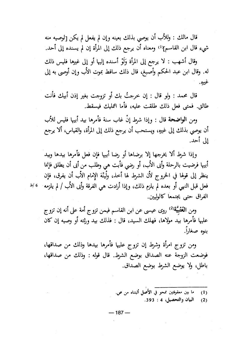 ومن الواضحة قال: وإن شرط إن غاب سنة فأمرها بيد أبيها فليس للأب أن يوصي بذلك إلى غيره، ويستحب أن يرجع ذلك إلى المرأة، والقياس، ألا يرجع إلى أحد.