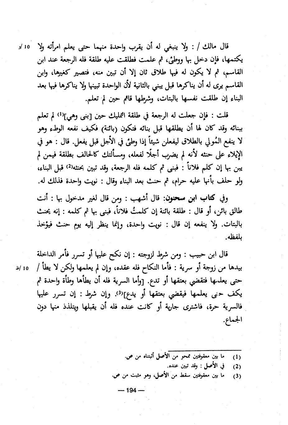 قال مالك/: لا ينبغي له أن يقرب واحدة منهما حتى يعلم امرأته ولا يكتمها، فإن دخل بها ووطئ، ثم علمت فطلقت عليه طلقة فله الرجعة عند ابن القاسم، ثم لا يكون له فيها طلاق ثان إلا أن تبين منه، فتصير كغيرها، وابن القاسم يرى له أن يناكرها قبل يبني بالثانية لأن الواحدة تبينها ولا يناكرها فيها بعد البناء إن طلقت نفسها بالبتات، وشرطها قائم حين لم تعلم.