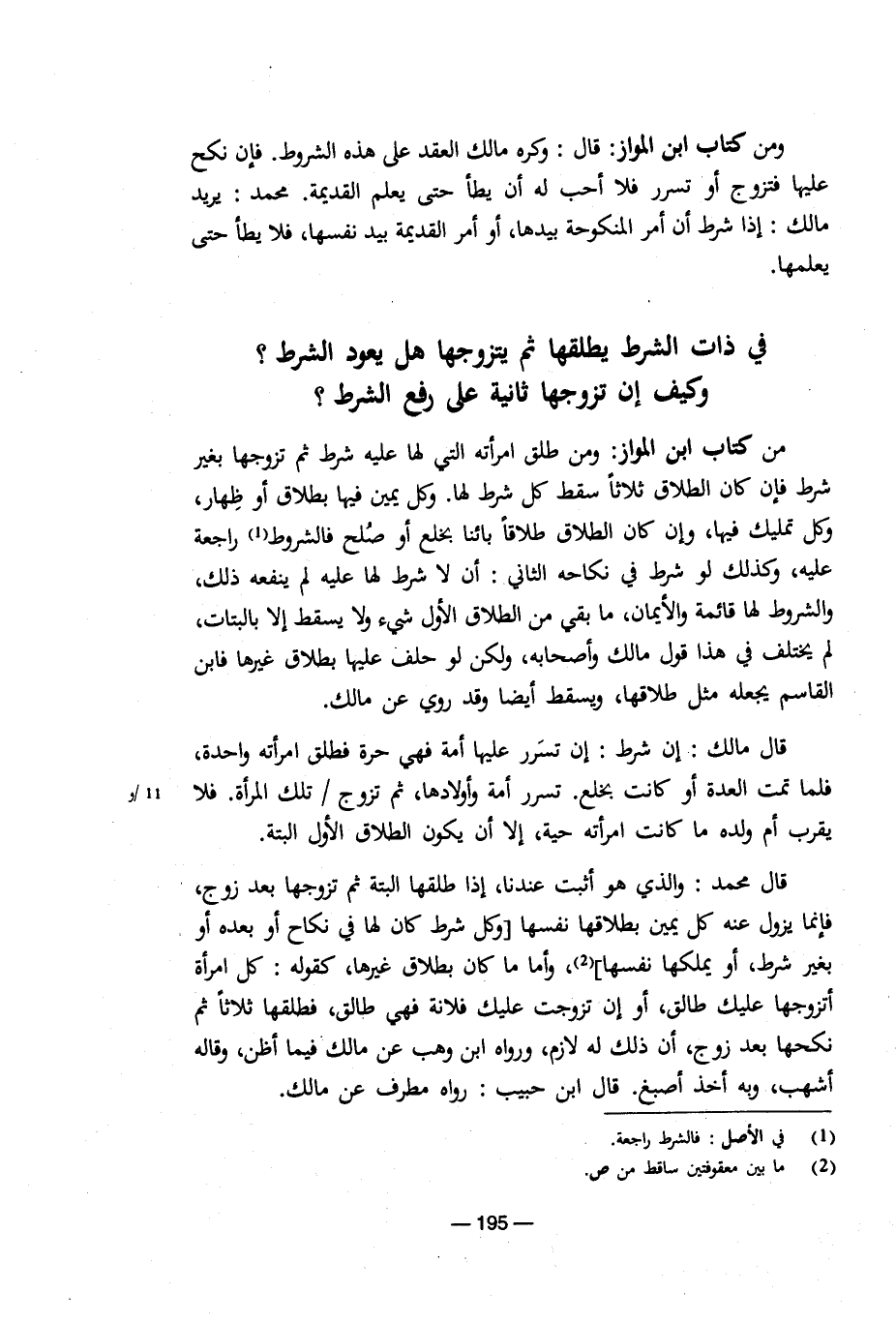 ومن كتاب ابن المواز: قال: وكره مالك العقد على هذه الشروط. فإن نكح عليها فتزوج أو تسرر فلا أحب له أن يطأ حتى يعلم القديمة. محمد: يريد مالك: إذا شرط أمر المنكوحة بيدها، أو أمر القديمة بيد نفسها، فلا يطأ حتى يعلمها.