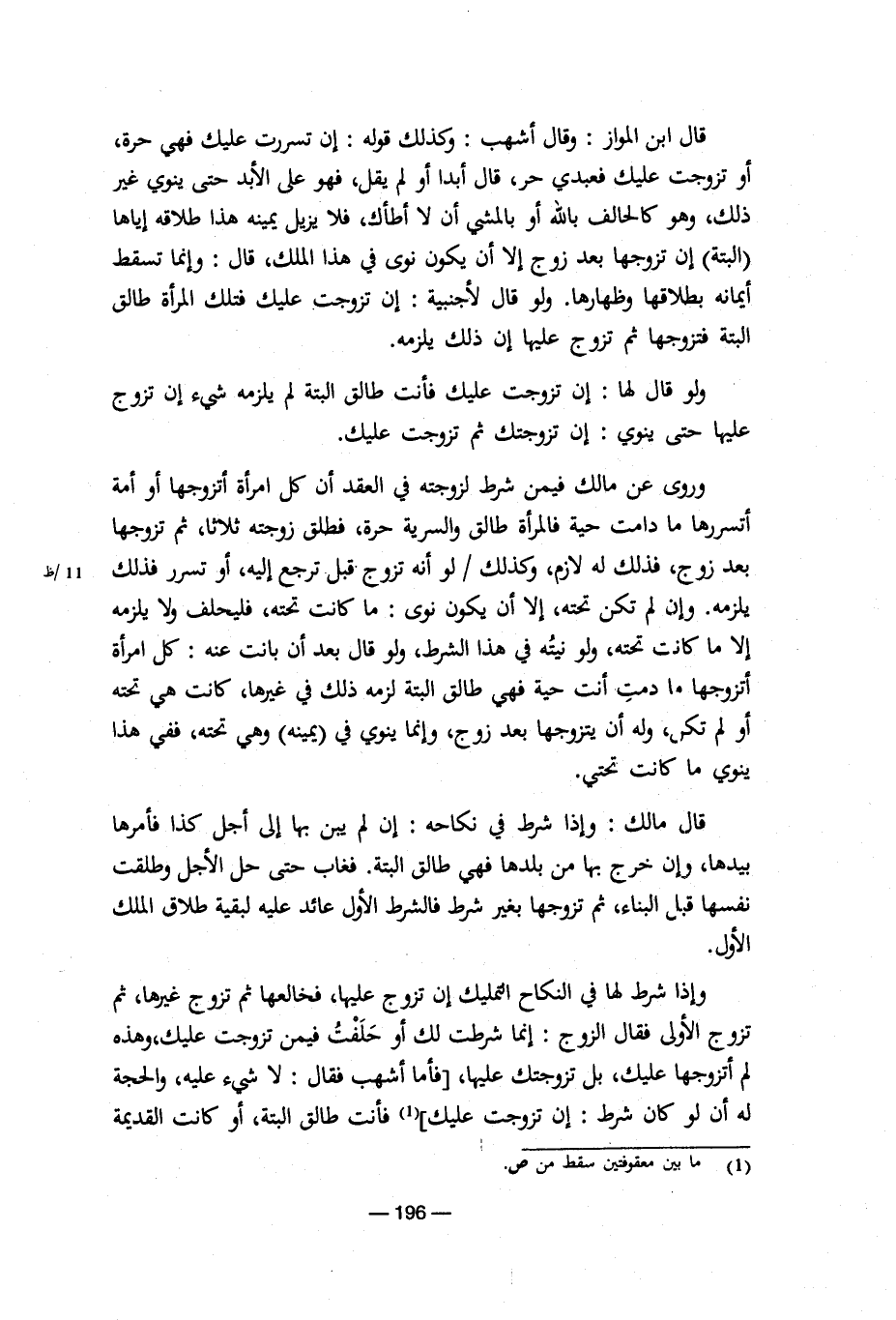 قال ابن المواز: وقال أشهب: وكذلك قوله: إن تسررت عليك فهي حرة، أو تزوجت عليك فعبدي حر، قال أبدا أو لم يقل، فهو على الأبد حتى ينوي غير ذلك، وهو كالحالف بالله أو بالمشيء أن لا أطأك، فلا يزيل يمينه هذا طلاقه إياها (البتة) إن تزوجها بعد زوج إلا أن يكون نوى في هذا الملك، قال: وإنما تسقط أيمانه بطلاقها وظهارها. ولو قال لأجنبية: إن تزوجت عليك فتلك المرأة طالق البتة فتزوجها ثم تزوج عليها إن ذلك يلزمه.