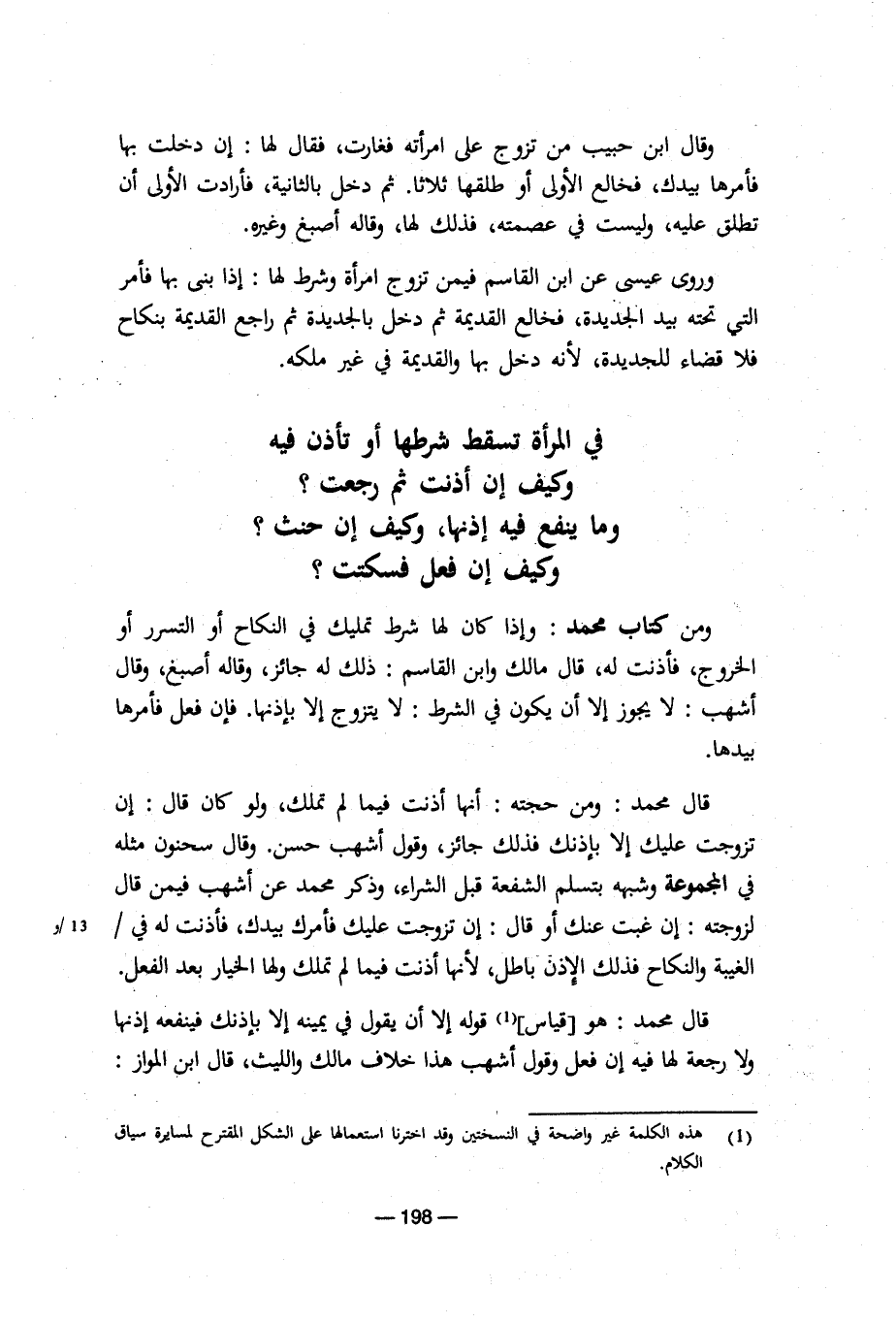 قال محمد: ومن حجته: أنها أذنت فيما لم تملك، ولو كان قال: إن تزوجت عليك إلا بإذنك فذلك جائز، وقول أشهب حسن. وقال سحنون مثله في المجموعة وشبهه بتسلم الشفعة قبل الشراء، وذكر محمد عن أشهب فيمن قال لزوجته: إن غبت عنك أو قال: إن تزوجت عليك فأمرك بيدك، فأذنت له في/ الغيبة والنكاح فذلك الإذن باطل، لأنها أذنت فيما لم تملك ولها الخيار بعد الفعل.