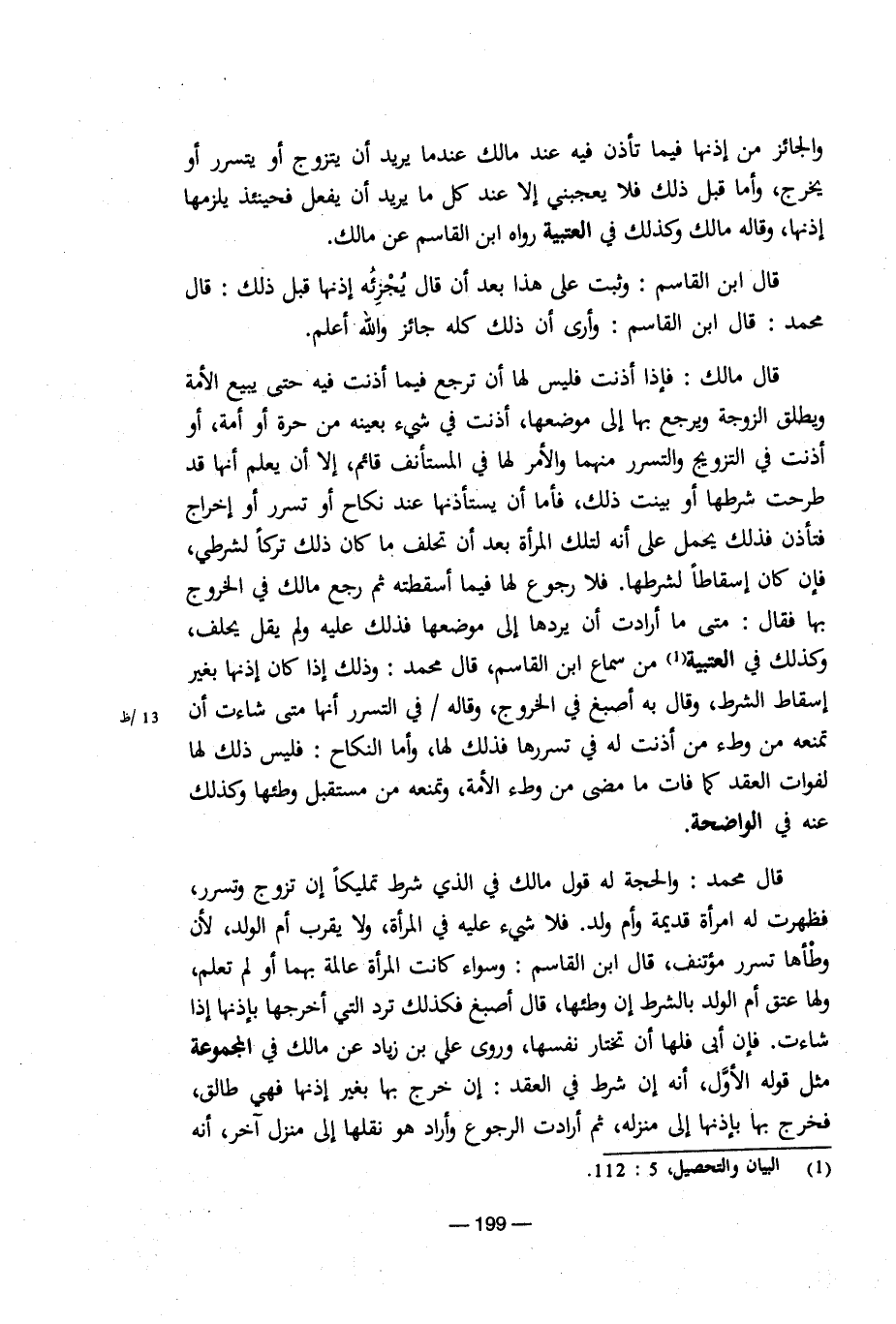 قال محمد: والحجة له قول مالك في الذي شرط تمليكا إن تزوج وتسرر، فظهرت له امرأة قديمة وأم ولد. فلا شيء عليه في المرأة، ولا يقرب أم الولد، لأن وطأها تسرر مؤتنف، قال ابن القاسم: وسواء كانت المرأة عالمة بهما أو لم تعلم، ولها عتق أم الولد بالشرط إن وطئها، قال أصبغ فكذلك ترد التي أخرجها بإذنها إذا شاءت. فإن أبي فلها أن تختار نفسها، وروى على بن زياد عن مالك في المجموعة مثل قوله الأول، أنه إن شرط في العقد: إن خرج بها بغير إذنها فهي طالق، فخرج بها بإذنها إلى منزله، ثم أرادت الرجوع وأراد هو نقلها إلى منزل آخر، أنه [5/ 199]