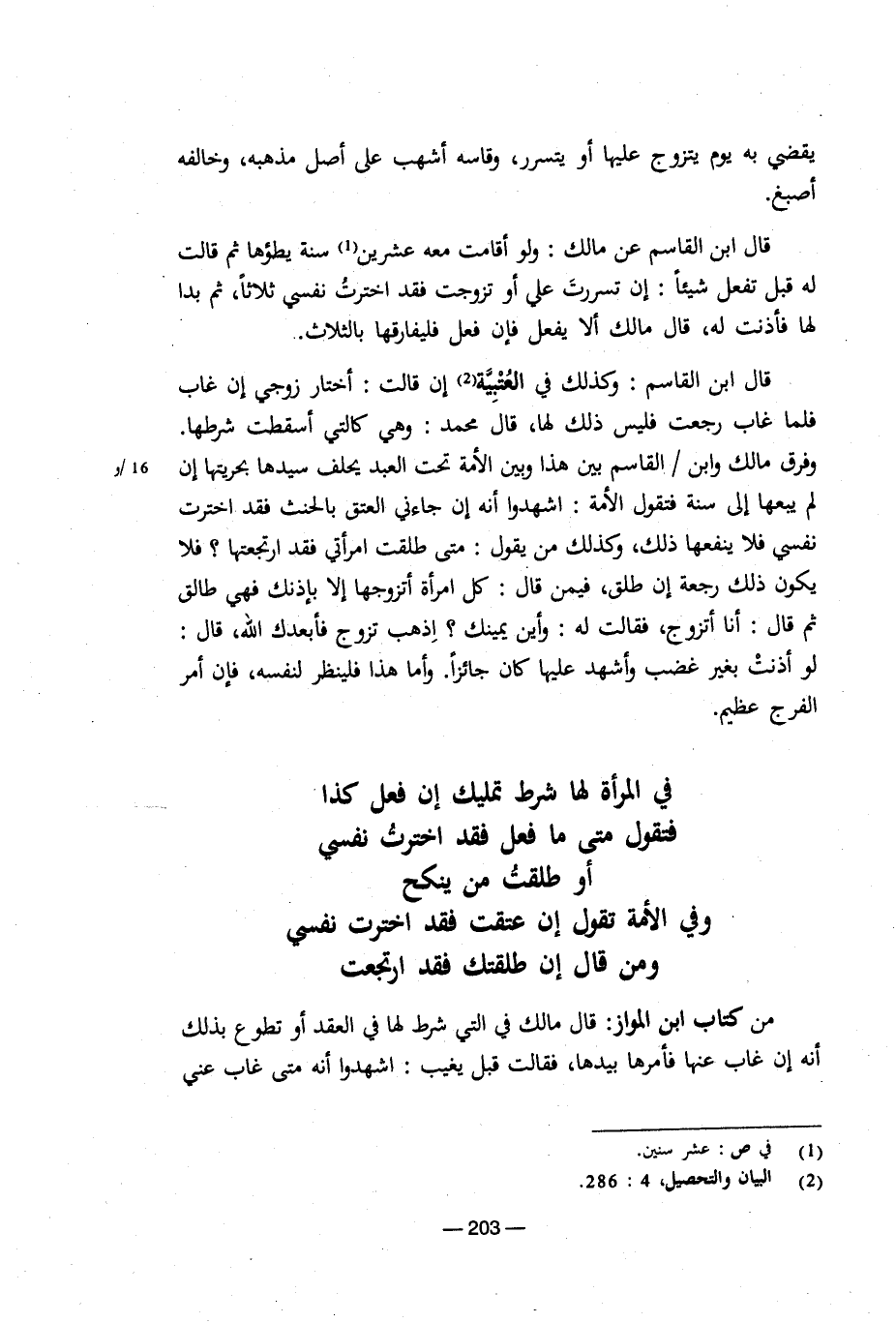 قال ابن القاسم: وكذلك في العتبية إن قالت: أختار زوجي إن غاب فلما غاب رجعت فليس ذلك لها، قال محمد: وهي كالتي أسقطت شرطها. وفرق مالك وابن/ القاسم بين هذا وبين الأمة تحت العبد يحلف سيدها بحريتها إن لم يبعها إلي سنة فتقول الأمة: اشهدوا أنه إن جاءني العتق بالحنث فقد اخترت نفسي فلا ينفعها ذلك، وكذلك من يقول: متى طلقت امرأتي فقد ارتجعتها؟ فلا يكون ذلك رجعة إن طلق، فيمن قال: كل امرأة أتزوجها إلا بإذنك فهي طالق ثم قال: أنا أتزوج، فقالت له: وأين يمينك؟ اذهب تزوج فأبعدك الله، قال: لو أذنت بغير غضب وأشهد عليها كان جائزاً. وأما هذا فلينظر لنفسه، فإن أمر الفرج عظيم.