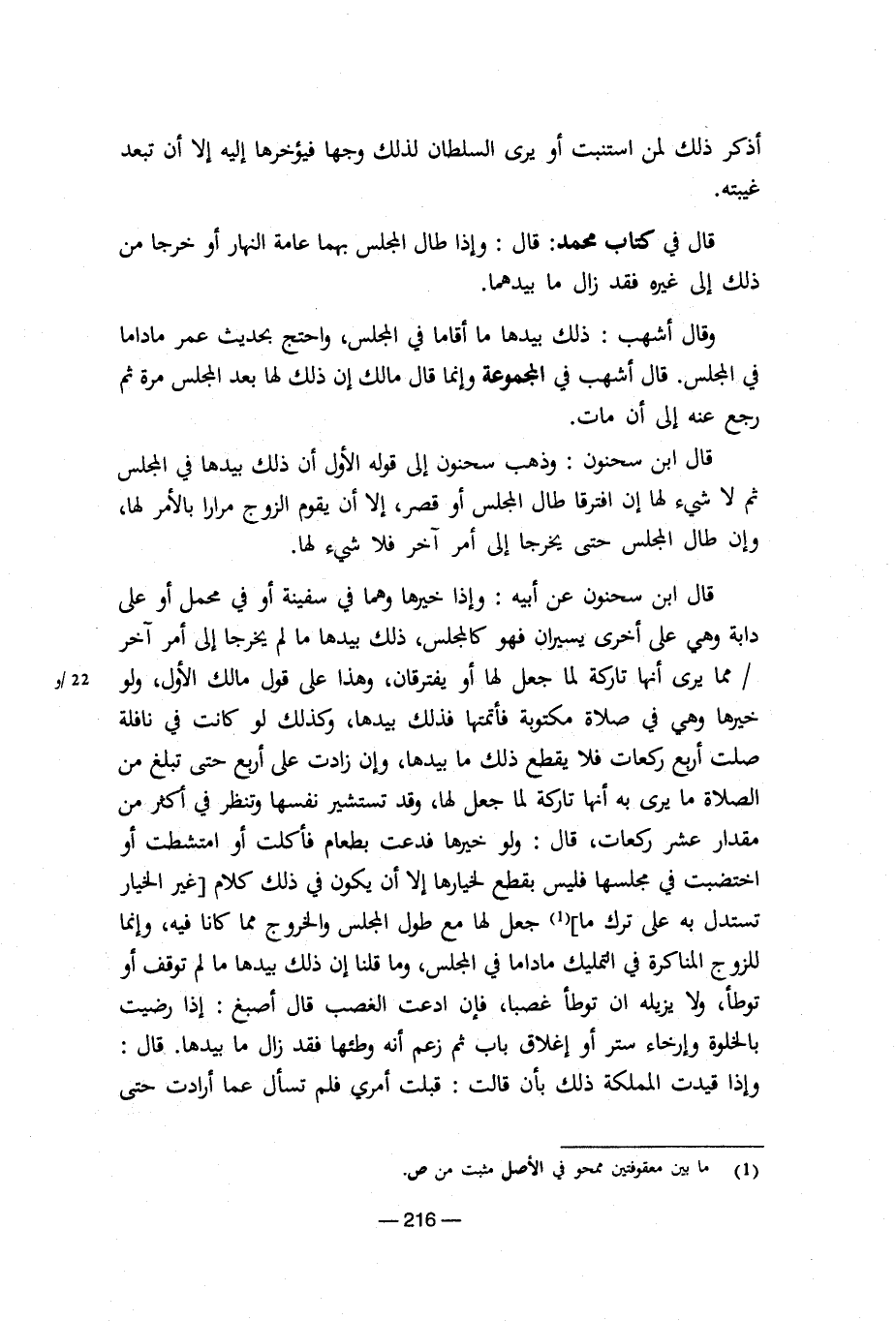 قال ابن سحنون: وذهب سحنون إلى قوله الأول أن ذلك بيدها في المجلس ثم لا شيء لها إن افترقا طال المجلس أو قصر، إلا أن يقوم الزوج مرارا بالأمر لها، وإن طال المجلس حتى يخرجا إلى أمر آخر فلا شيء لها.