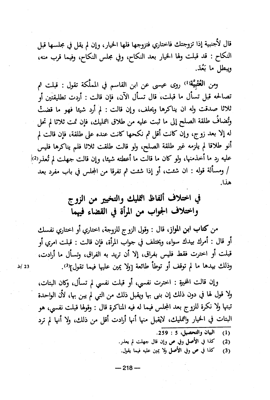 من كتاب ابن المواز، قال: وقول الزوج للزوجة، اختاري أو اختاري نفسك أو قال: أمرك بيدك سواء، ويختلف في جواب المرأة، فإن قالت: قبلت امري أو قبلت أو اخترت فقط فليس بفراق، إلا أن تريد به الفراق، وتسأل ما أرادت، وذلك بيدها ما لم توقف أو توطأ طائعة [ولا يمين عليها فيما تقول].