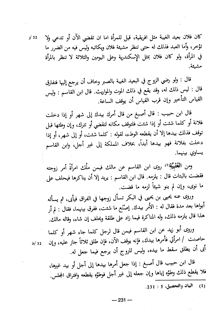 كان فلان بعيد الغيبة مثل افريقية، قيل للمرأة اما ان تقضي الآن أو تدعي ولا تؤخر، وأما العبد فذلك له حتى تنظر مشيئة فلان ويكاتبه وليس فيه من الضرر ما في المرأة، ولو كان فلان بمثل الإسكندرية وعلى اليومين والثلاثة لا تنظر بالمرأة مشيئة.