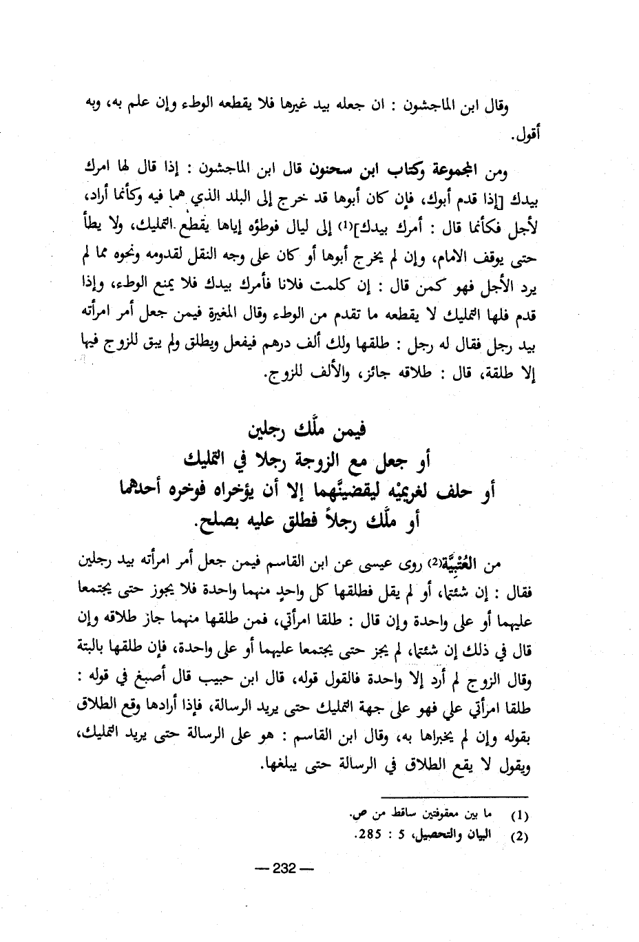 ومن العتبية روى عيسى عن ابن القاسم فيمن جعل أمر امرأته بيد رجلين فقال: إن شئتما، أو لم يقل فطلقها كل واحد منهما واحدة فلا يجوز حتى يجتمعا عليهما أو على واحدة وإن قال: طلقا امرأتي، فمن طلقها منهما جاز طلاقه وإن قال في ذلك إن شئتما، لم يجز حتى يجتمعا عليهما أو على واحدة، فإن طلقها بالبتة وقال الزوج لم أرد إلا واحدة فالقول قوله، قال ابن حبيب قال أصبغ في قوله: طلقا امرأتي علي فهو على وجهة التمليك حتى يريد الرسالة، فإذا أرادها وقع الطلاق بقوله وإن لم يخبراها به، وقال ابن القاسم: هو على الرسالة حتى يريد التمليك ويقول لا يقع الطلاق في الرسالة حتى يبلغها. [5/ 232]