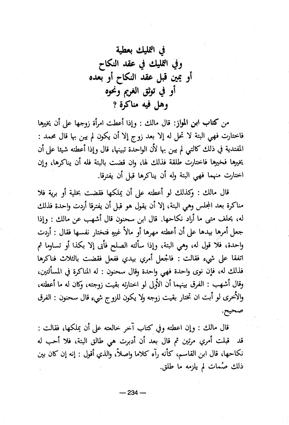 قال مالك: وكذلك لو أعطته على أن يملكها فقضت بخلية أو برية فلا مناكرة بعد المجلس وهي البتة، إلا أن يقول هو قبل أن يفترقا أردت واحدة فذلك له، يحلف متى ما أراد نكاحها. قال ابن سحنون قال أشهب عن مالك: وإذا جعل أمرها بيدها على أن أعطته مهرها أو مالا غيره فتختار نفسها فقال: أردت واحدة، فلا قول له، وهي البتة، وإذا سألته الصلح فأبي إلا بكذا أو تساوما ثم اتفقا على شيء فقالت: فاجعل أمري بيدي ففعل فقضت بالثلاث فناكرها فذلك له، فإن نوى واحدة فهي واحدة وقال سحنون: له المناكرة في المسألتين، وقال أشهب: الفرق بينهما أن الأولى لو اختارته بقيت زوجته، وكان له ما أعطته، والأخرى لو أبت أن تختار بقيت زوجه ولا يكون للزوج شيء قال سحنون: الفرق صحيح.
