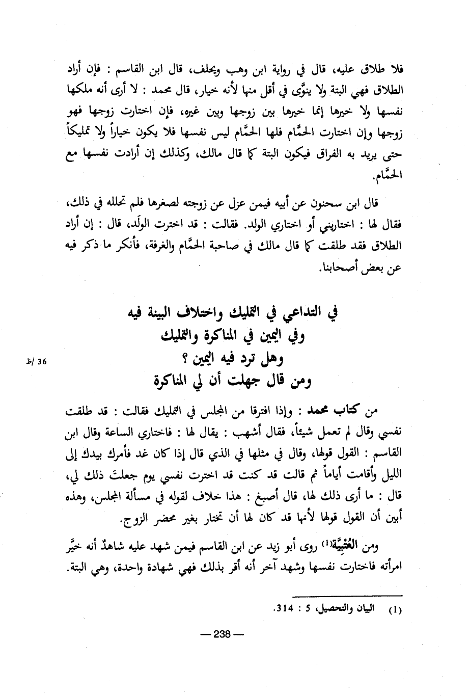 ومن العتبية روى أبو زيد عن ابن القاسم فيمن شهد عليه شاهد أنه خير امرأته فاختارت نفسها وشهد أخر أنه أقر بذلك فهي شهادة واحدة، وهي البتة. [5/ 238]