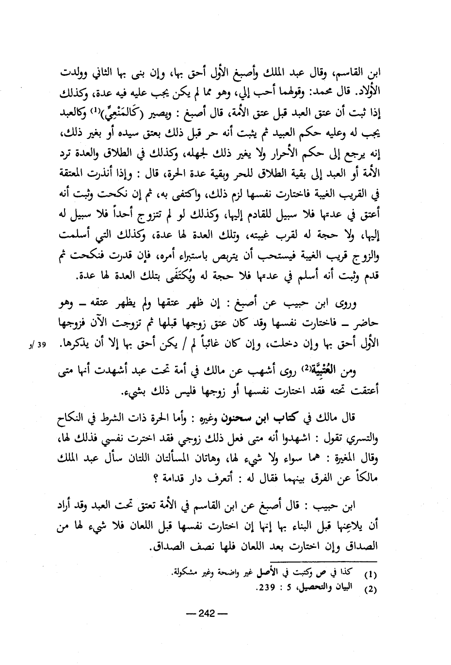 ابن القاسم، وقال عبد الملك وأصبغ الأول أحق بها، وإن بني بها الثاني وولدت الأولاد. قال محمد: وقولهما أحب إلي، وهو مما لم يكن يجب عليه فيه عدة، وكذلك إذا ثبت أن عتق العبد قبل عتق الأمة، قال أصبغ: ويصير (كالمنعي) وكالعبد يجب له وعليه حكم العبيد ثم يثبت أنه حر قبل ذلك بعتق سيده أو بغير ذلك، إنه يرجع إلى حكم الأحرار ولا يغير ذلك لجهله، وكذلك في الطلاق والعدة ترد الأمة أو العبد إلى بقية الطلاق للحر وبقية عدة الحرة، قال: وإذا أنذرت المعتقة في القريب الغيبة فاختارت نفسها لزم ذلك، واكتفي به، ثم إن نكحت وثبت أنه أعتق في عدتها فلا سبيل للقادم إليها، وكذلك لو لم تتزوج أحداً فلا سبيل له إليها، ولا حجة له لقرب غيبت، وتلك العدة لها عدة، وكذلك التي أسلمت والزوج قريب الغيبة فيستحب أن يتربص باستبراء أمره، فإن قدرت فنكحت ثم قدم وثبت أنه أسلم في عدتها فلا حجة له ويكتفي بتلك العدة لها عدة.