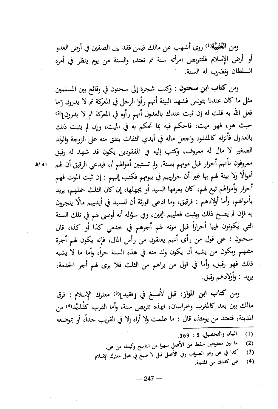 ومن كتاب ابن سحنون: وكتب شجرة إلى سحنون في وقائع بين المسلمين مثل ما كان عندنا بتونس فشهد البينة أنهم رأوا الرجل في المعركة ثم لا يدرون [ما فعل الله به قلت له إن ثبت عندك بالعدول أنهم رأوه في المعركة ثم لا يدرون] حيث هو، فهو ميت، فاحكم فيه بما تحكم به في الميت، وإن لم يثبت ذلك بالعدول فأنزله كالمفقود واجعل ماله في أيدي الثقات ينفق منه على الزوجة والولد الصغير لا مال له معروف، وكتب إليه في المفقودين يكون قد شهد له رقيق معروفون بأنهم أحرار قبل موتهم بسنة. ولم تستبين أموالهم /، فيدعي الرقيق أن لهم أموالا ولا بينة لهم بها غير أن جواريهم في بيوتهم فكتب إليهم: إن ثبت الموت فهم أحرار وأموالهم تبع لهم، كان يعرفها السيد أو يجهلها، إن كان الثلث حملهم، يريد بأموالهم، وأما أولادهم: فرقيق، وما ادعى الورثة أن للسيد في أيديهم مالا يتجرون به فإن لم يصح ذلك ويثبت فعليهم اليمين، وفي سؤاله أنه أوصى لهم في تلك السنة التي يكونون فيها أحراراً قبل موته لهم أجرهم في خدمي كذا أو كذا، قال سحنون: على قول من رأى أنهم يعتقون من رأس المال، فإنه يكون لهم أجرة مثلهم ويكون من يشبه أن يكون ولد منه في هذه السنة حراً، وأما مالا يشبه ذلك فهو رقيق، وإما في قول من يراهم من الثلث فلا يري لهم أجر الخدمة، يريد: وأولادهم رقيق.