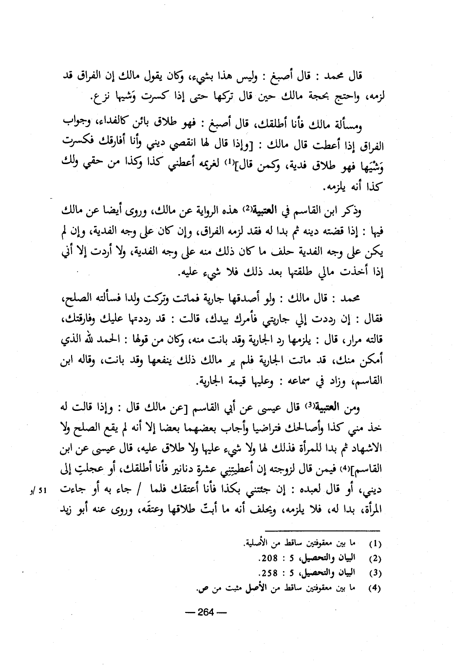 وذكر ابن القاسم في العتبية هذه الرواية عن مالك، وروى أيضا عن مالك فيها: إذا قضته دينه ثم بدا له فقد لزمه الفراق، وإن كان على وجه الفدية، وإن لم يكن على وجه الفدية حلف ما كان ذلك منه على وجه الفدية، ولا أردت إلا أني إذا أخذت مالي طلقتها بعد ذلك فلا شيء عليه.
