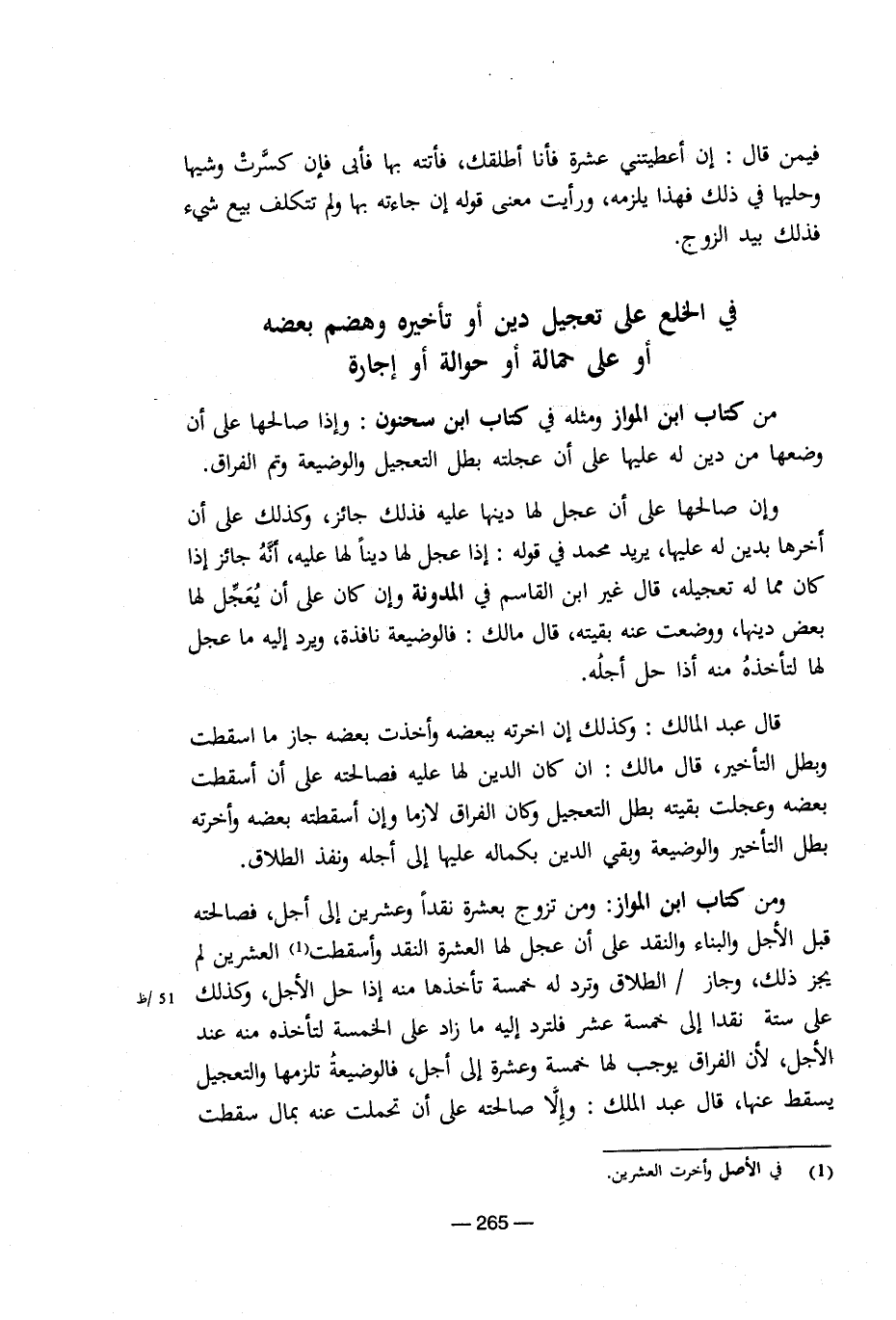 ومن كتاب ابن المواز: ومن تزوج بعشرة نقداً وعشرين إلى أجل، فصالحته قبل الأجل والبناء والنقد على أن عجل لها العشرة النقد وأسقطت العشرين لم يجز ذلك، وجاز / الطلاق وترد له خمسة تأخذها منه إذا حل الأجل، وكذلك على ستة نقدا إلى خمسة عشر فلترد إليه ما زاد على الخمسة لتأخذه منه عند الأجل، لأن الفراق يوجب لها خمسة وعشرة إلى أجل، فالوضيعة تلزمها والتعجيل يسقط عنها، قال عبد الملك: وإلا صالحته على أن تحملت عنه بمال سقطت [5/ 265]