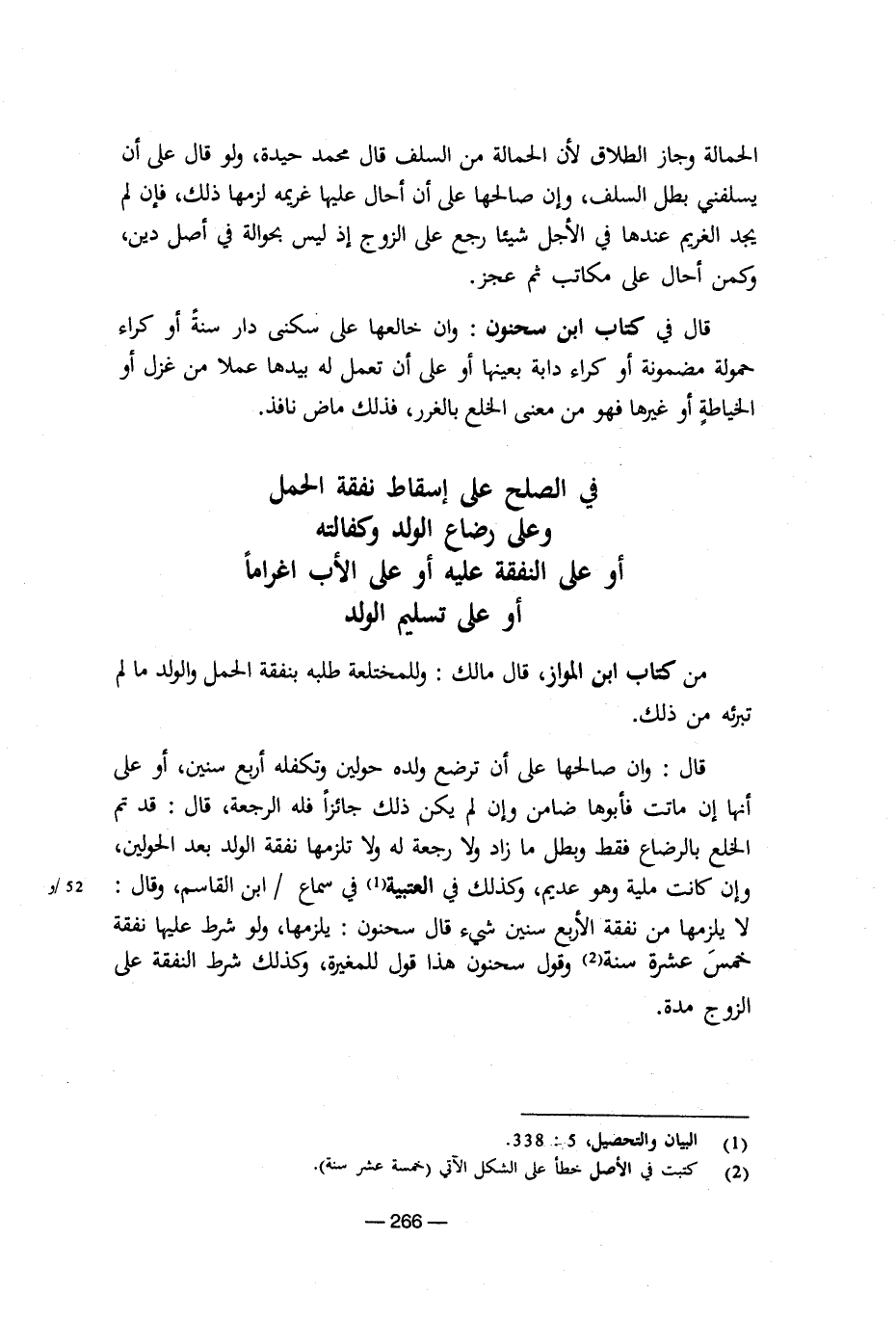 قال: وإن صالحها على أن ترضع ولده حولين وتكفله أربع سنين، أو على أنها إن ماتت فأبوها ضامن وإن لم يكن ذلك جائزا فله الرجعة، قال: قد تم الخلع بالرضاع فقط وبطل ما زاد ولا رجعة له ولا تلزمها نفقة الولد بعد الحولين، وإن كانت ملية وهو عديم، وكذلك في العتبية في سماع / ابن القاسم، وقال: لا يلزمها من نفقة الأربع سنين شيء قال سحنون: يلزمها، ولو شرط عليها نفقة خمس عشرة سنة وقول سحنون هذا قول للمغير، وكذلك شرط النفقة على الزوج مدة. [5/ 266]