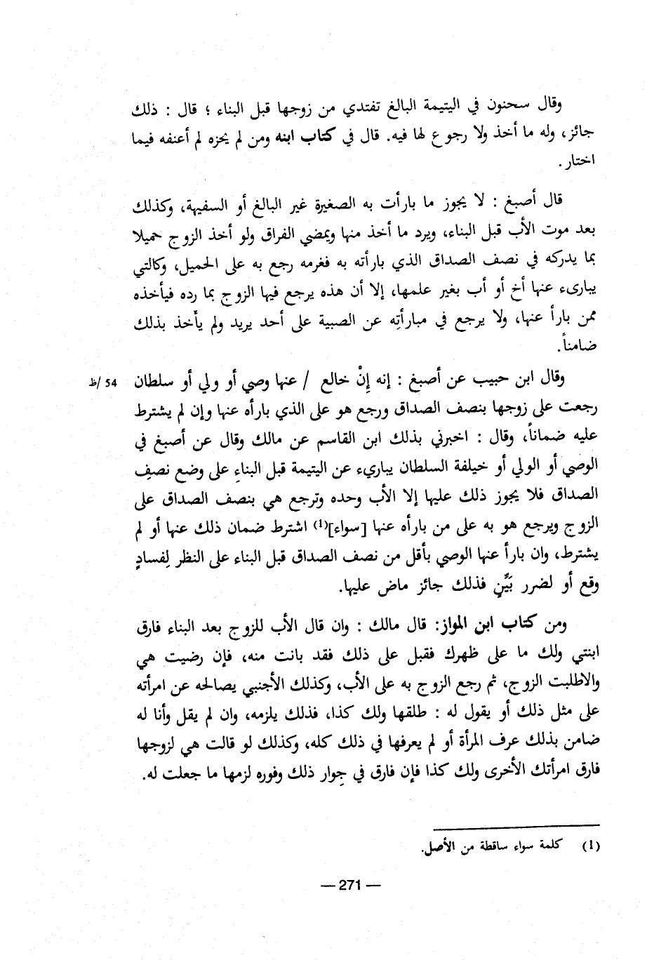 وقال ابن حبيب عن أصبغ: إنه إن خالع/ عنها وصي أو ولي أو سلطان رجعت على زوجها بنصف الصداق ورجع هو على الذي بارأة عنها وإن لم يشترط عليه ضمانا، وقال: اخبرني بذلك ابن القاسم عن مالك وقال عن أصبغ في الوصي أو الولي أو خليفة السلطان يبارئ عن اليتيمة قبل البناء على وضع نصف الصداق فلا يجوز ذلك عليها إلا الأب وحده وترجع هي بنصف الصداق على الزوج ويرجع هو به على من بارأه عنها [سواء] اشترط ضمان ذلك عنها أو لم يشترط، وان بارأ عنها الوصي بأقل من نصف الصداق قبل البناء على النظر لفساد وقع أو لضرر بين فذلك جائز ماض عليها.