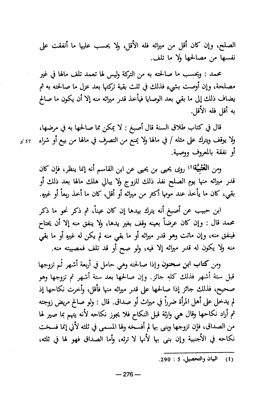 ومن كتاب ابن سحنون وإذا صالحته وهي حامل في أربعة أشهر ثم تزوجها قبل ستة أشهر فذلك كله جائز. وإن صالحها بعد ستة أشهر ثم تزوجها وهو صحيح، فذلك جائز إذا صالحها على قدر ميراثه منها فأقل، وأخرت نكاحها إذ لم يدخل على أهل المرأة ضررا في ميراث أو صداق. قال: ولو صالح مريض زوجته ثم أراد نكاحها وقال هي وارثه قبل النكاح فلا يجوز نكاحه لأنه يتهم بما صير لها من الصداق، فإن تزوجها وبنى بها لم أفسخه ولها المسمى في ثلثه لأني إنما فسخت نكاحه في الأجنبية وإن بنى بها لأنها لا ترثه، وأما الصداق فهو لها في ثلثه، [5/ 276]