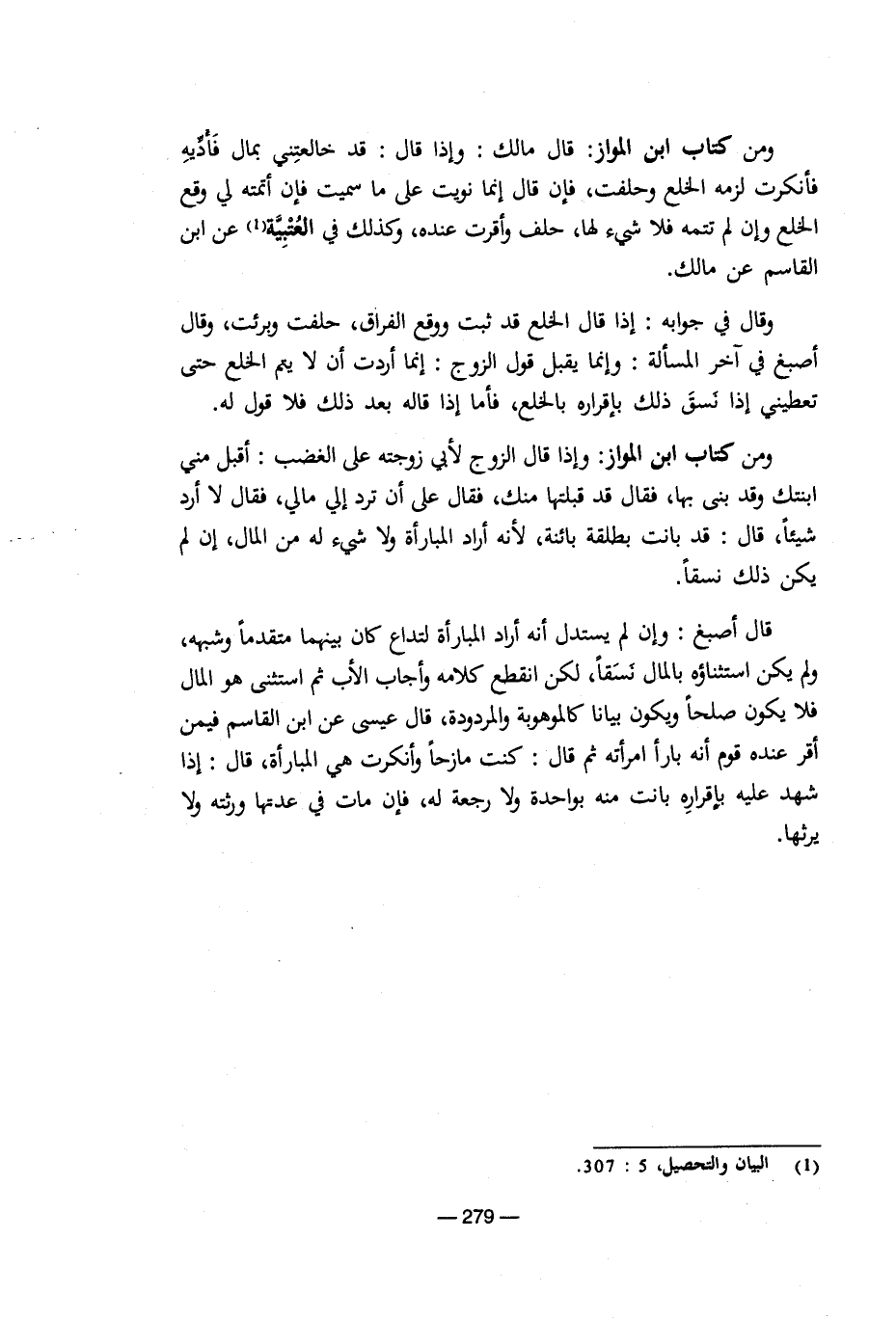 قال أصبغ: وإن لم يستدل أنه أراد المبارأة لتداع كان بينهما متقدما وشبهه، ولم يكن استثناؤه بالمال نسقا، لكن انقطع كلامه وأجاب الأب ثم استثنى هو المال فلا يكون صلحا ويكون بيانا كالموهوبة والمردودة، قال عيسى عن ابن القاسم فيمن أقر عنده قوم أنه بارأ امرأته ثم قال: كنت مازحا وأنكرت هي المباراة، قال: إذا شهد عليه بإقراره بانت منه بواحدة ولا رجعة له، فإن مات في عدتها ورثته ولا يرثها. [5/ 279]