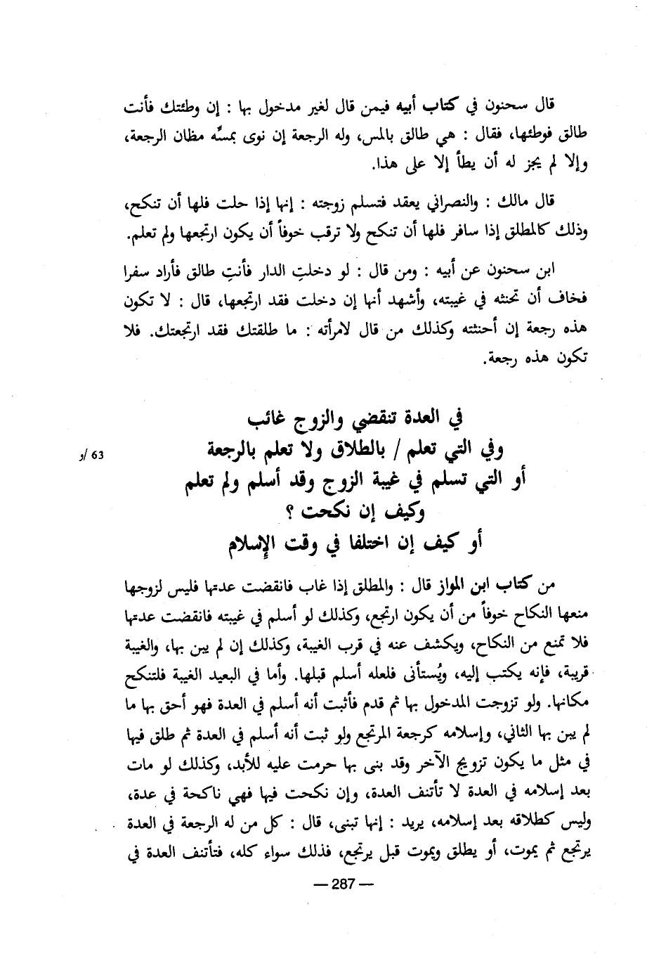 من كتاب ابن المواز قال: والمطلق إذا غاب فانقضت عدتها فليس لزوجها منعها النكاح خوفا من أن يكون ارتجع، وكذلك لو أسلم في غيبته فانقضت عدتها فلا تمنع من النكاح، ويكشف عنه في قرب الغيبة، وكذلك إن لم بين بها، والغيبة قريبة، فإنه يكتب إليه، ويستأنى فلعله أسلم قبلها. وأما في البعيد الغيبة فلتنكح مكانها. ولو تزوجت المدخول بها ثم قدم فأثبت أنه أسلم في العدة فهو أحق بها ما لم يبن بها الثاني، وإسلامه كرجعة المرتجع ولو ثبت أنه أسلم في العدة ثم طلق فيها في مثل ما يكون تزويج الآخر وقد بني بها حرمت عليه للأبد، وكذلك لو مات بعد إسلامه في العدة لا تأتنف العدة، وإن نكحت فيها فهي ناكحة في عدة، وليس كطلاقه بعد إسلامه، يريد: إنها تبنى، قال: كل من له الرجعة في العدة يرتجع ثم يموت، أو يطلق ويموت قبل يرتجع، فذلك سواء كله، فتأتنف العدة في [5/ 287]