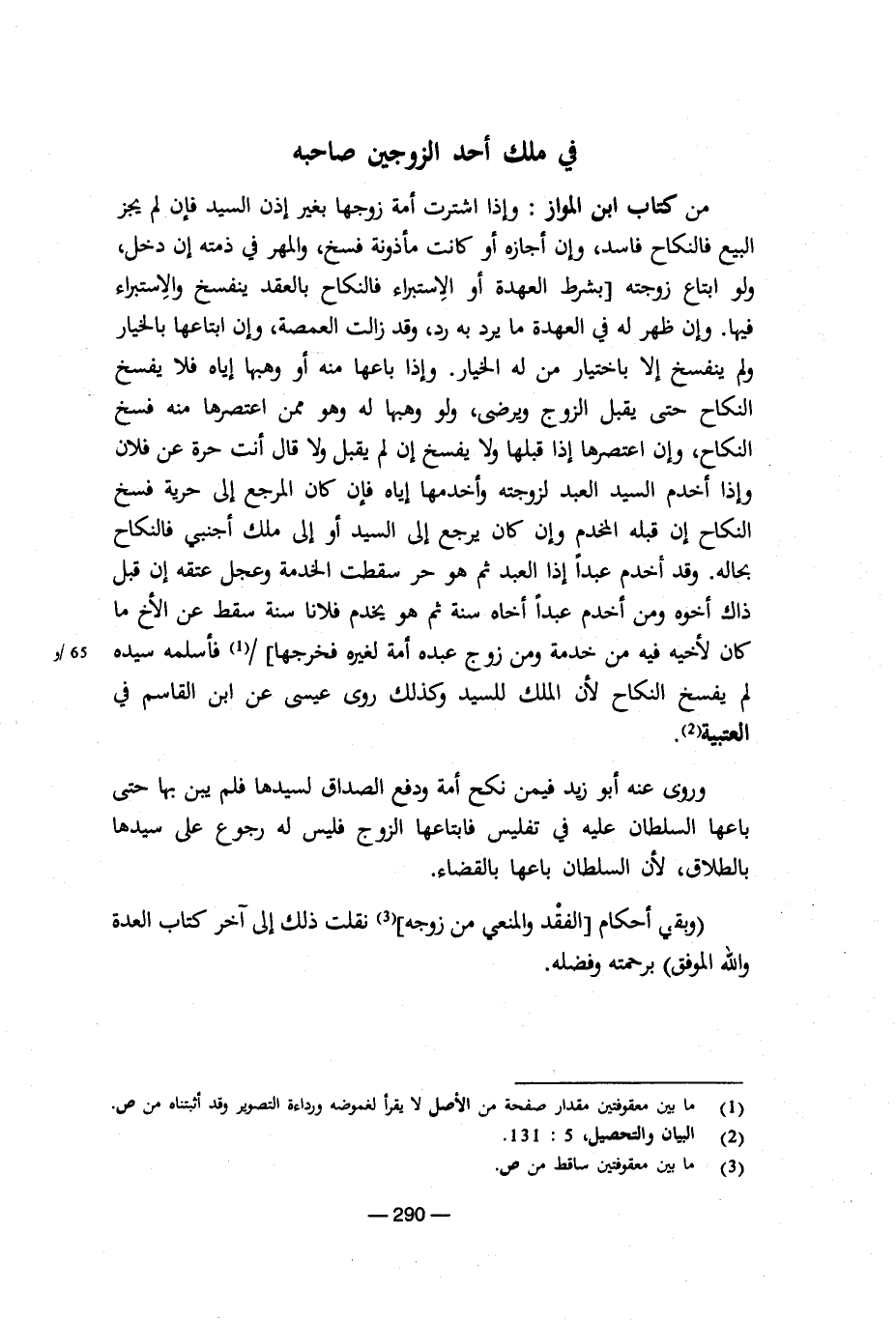 (وبقي أحكام [الفقد والمنعي من زوجه] نقلت ذلك إلى آخر كتاب العدة والله الموفق) برحمته وفضله. [5/ 290]