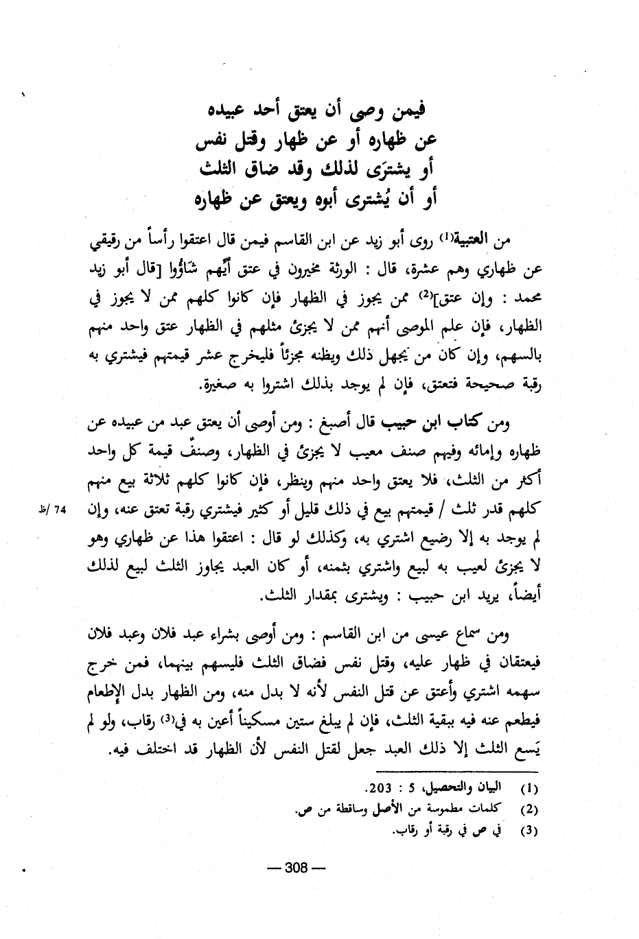 ومن كتاب ابن حبيب قال أصبغ: ومن أوصى أن يعتق عبد من عبيده عن ظهاره وإمائه وفيهم صنف معيب لا يجزئ في الظهار، وصنف قيمة كل واحد أكثر من الثلث / قيمتهم بيع في ذلك قليل أو كثير فيشتري رقبة تعتق عنه، وإن لم يوجد به إلا رضيع اشتري به، وكذلك لو قال: اعتقوا هذا عن ظهاري وهو لا يجزئ لعيب به لبيع واشتري بثمنه، أو كان العبد يجاوز الثلث لبيع لذلك أيضا، يريد ابن حبيب: ويشترى بمقدار الثلث.