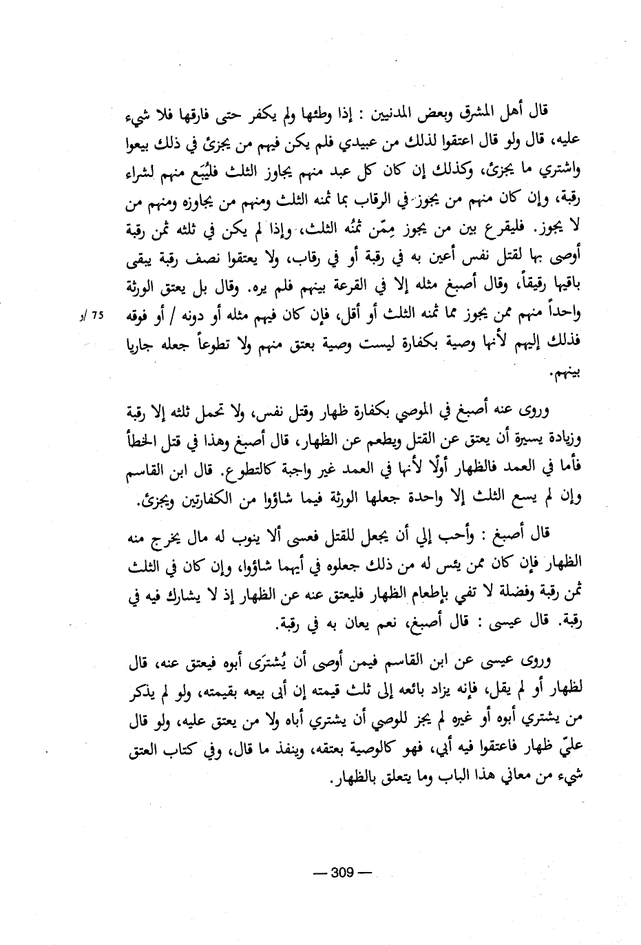 وروى عيسى عن ابن القاسم فيمن أوصى أن يشترى أبوه فيعتق عنه، قال لظهار أو لم يقل، فإنه يزاد بائعه إلى ثلث قيمته إن أبى بيعه بقيمته، ولو لم يذكر من يشتري أبوه أو غيره لم يجز للوصي أن يشتري أباه ولا من يعتق عليه، ولو قال علي ظهار فاعتقوا فيه أبي، فهو كالوصية بعتقه، وينفذ ما قال، وفي كتاب العتق شيء من معاني هذا الباب وما يتعلق بالظهار. [5/ 309]