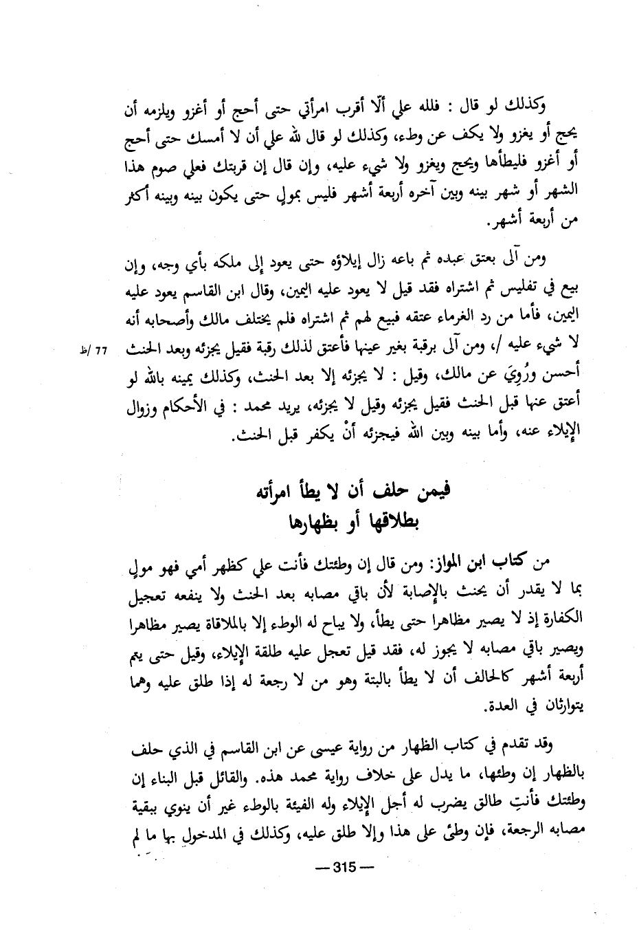 ومن آلى بعتق عبده ثم باعه زال إيلاؤه حتى يعود إلى ملكه بأي وجه، وإن بيع في تفليس ثم اشتراه فقد قيل لا يعود عليه اليمين، وقال ابن القاسم يعود عليه اليمين، فأما من رد الغرماء عتقه فبيع لهم ثم اشتراه فلم يختلف مالك وأصحابه أنه لا شيء عليه /، ومن آلى برقبة بغير عينها فأعتق لذلك رقبة فقيل يجزئه وبعد الحنث أحسن وروى عن مالك، وقيل: لا يجزئه إلا بعد الحنث، وكذلك يمينه بالله لو اعتق عنها قبل الحنث فقيل يجزئه وقيل لا يجزئه، يريد محمد: في الأحكام وزوال الإيلاء عنه، وأما بينه وبين الله فيجزئه أن يكفر قبل الحنث.