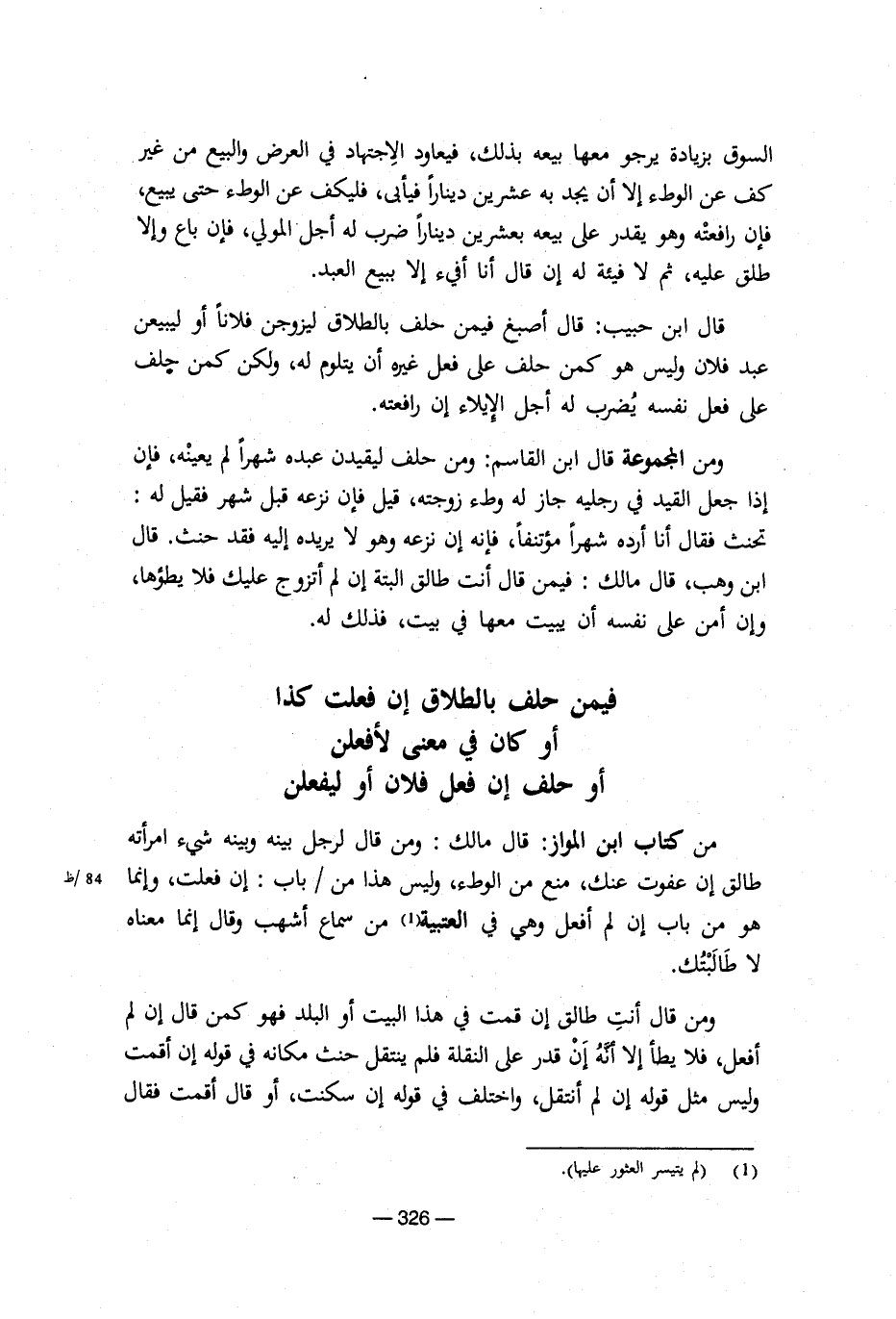 من كتاب ابن المواز: قال مالك: ومن قال لرجل بينه وبينه شيء امرأته طالق إن عفوت عنك، منع من الوطء، وليس هذا من / باب: إن فعلت، وإنما هو من باب إن لم أفعل وهي في العتبية من سماع أشهب وقال إنما معناه لا طالبتك.