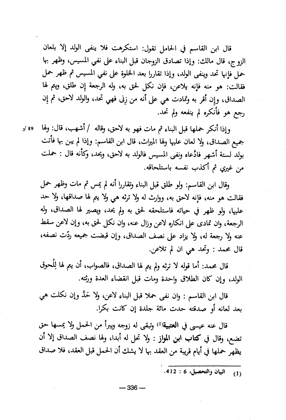 وقال ابن القاسم: ولو طلق قبل البناء وتقاررا أنه لم يمس ثم مات وظهر حمل فقالت هو منه، فإنه لاحق به، ووارث له ولا ترثه هي ولا يتم لها صداقها، ولا حد عليها، ولو ظهر في حياته فاستلحقه لحق به ولم يحد، ويصير لها الصداق، وله الرجعة، وان تمادى على انكاره لاعن وزال عنه، وان نكل لحق به، وإن لاعن سقط عنه ولا رجعة له، ولا يزاد على نصف الصداق، وإن قبضت جمعيه ردت نصفه، قال محمد: وتحد هي أن لم تلاعن.