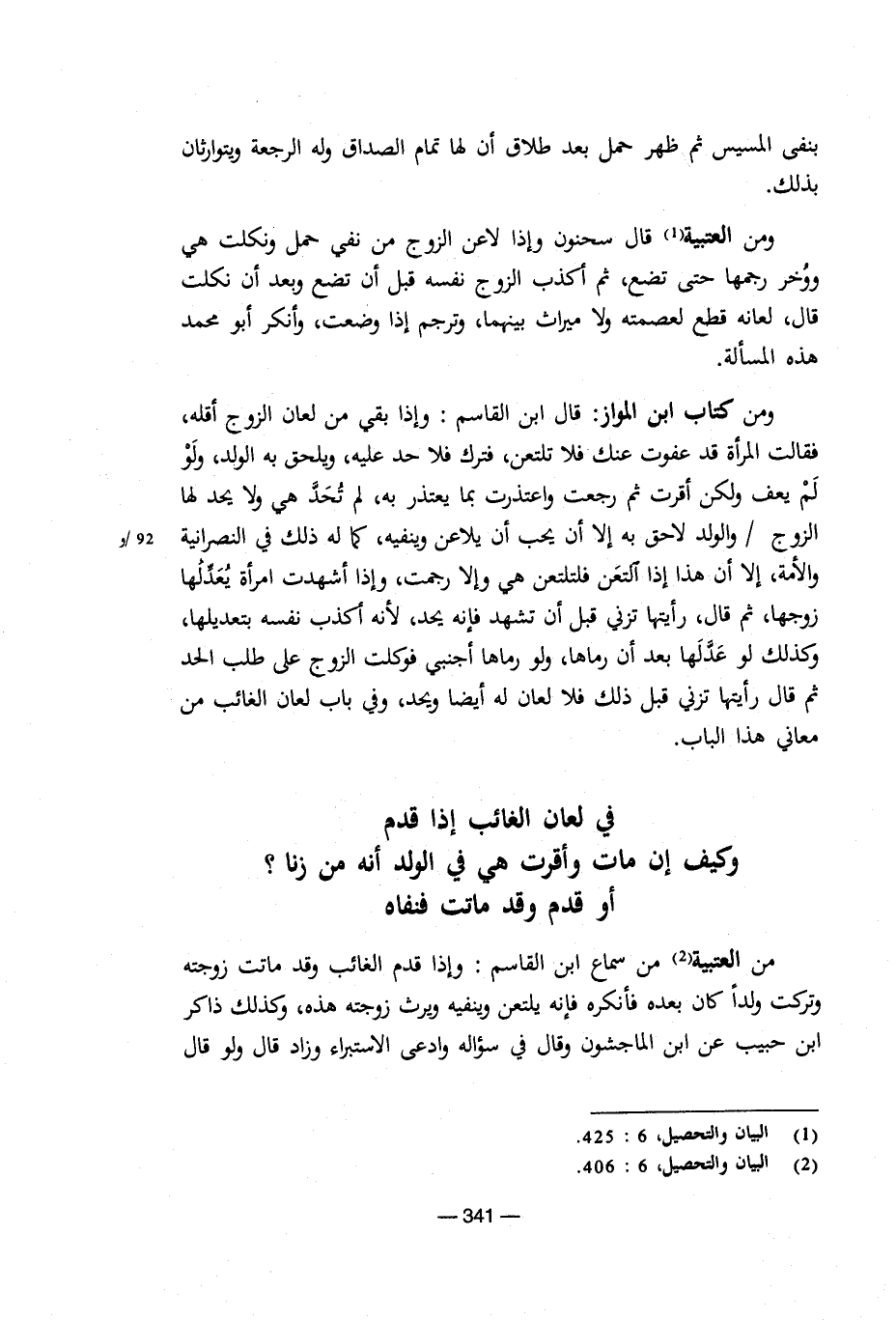 من العتبية من سماع ابن القاسم: وإذا قدم الغائب وقد ماتت زوجته وتركت ولدا كان بعده فأنكره فإنه يلتعن وينفيه ويرث زوجته هذه، وكذلك ذاكر ابن حبيب عن ابن الماجشون وقال في سؤاله وادعى الاستبراء وزاد قال ولو قال [5/ 341]