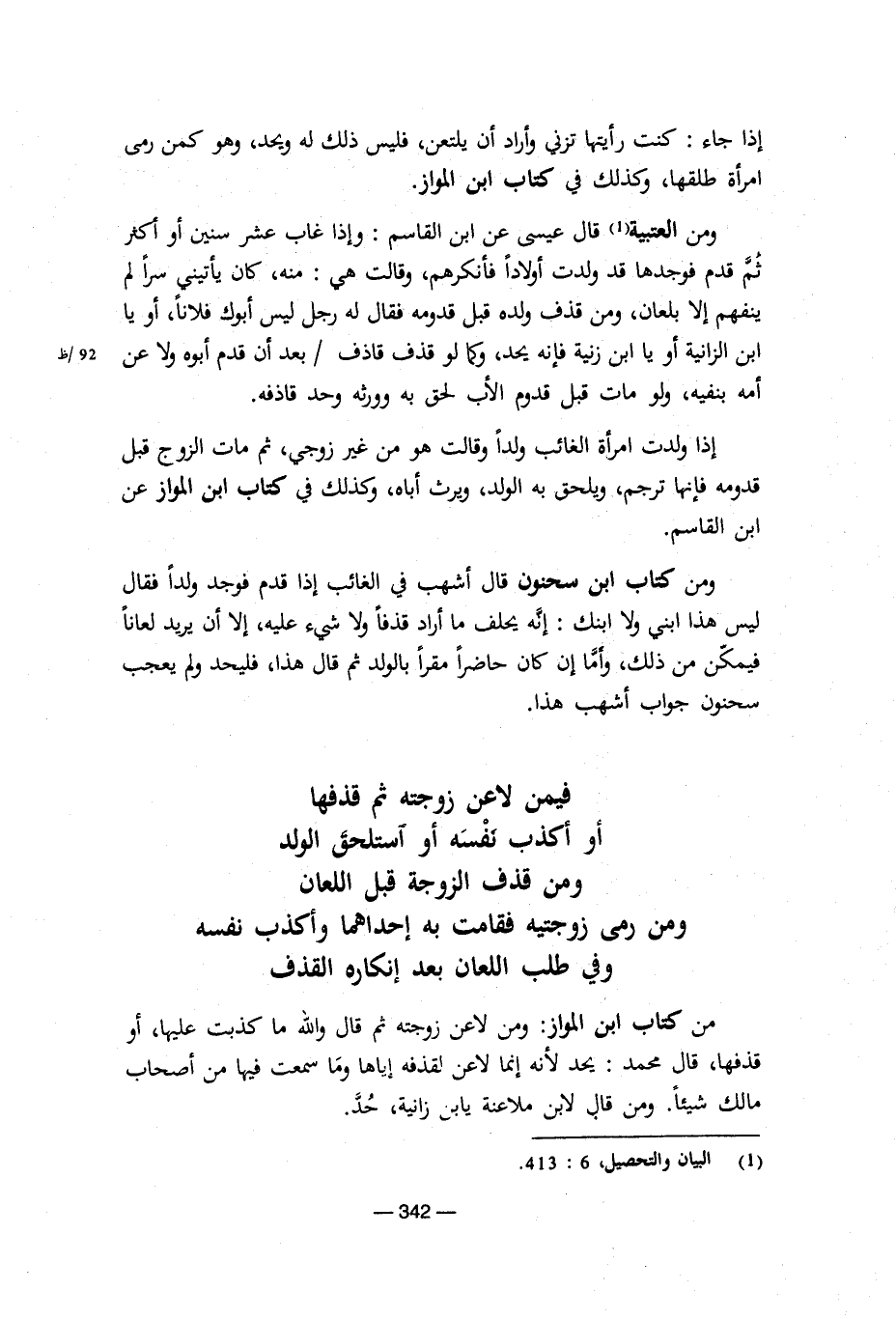 من كتاب ابن المواز: ومن لاعن زوجته ثم قال والله ما كذبت عليها، أو قذفها، قال محمد: يحد لأنه إنما لاعن لقذفه إياها وما سمعت فيها من أصحاب مالك شيئا. ومن قال لابن ملاعنة يا بن زانية، حد. [5/ 342]