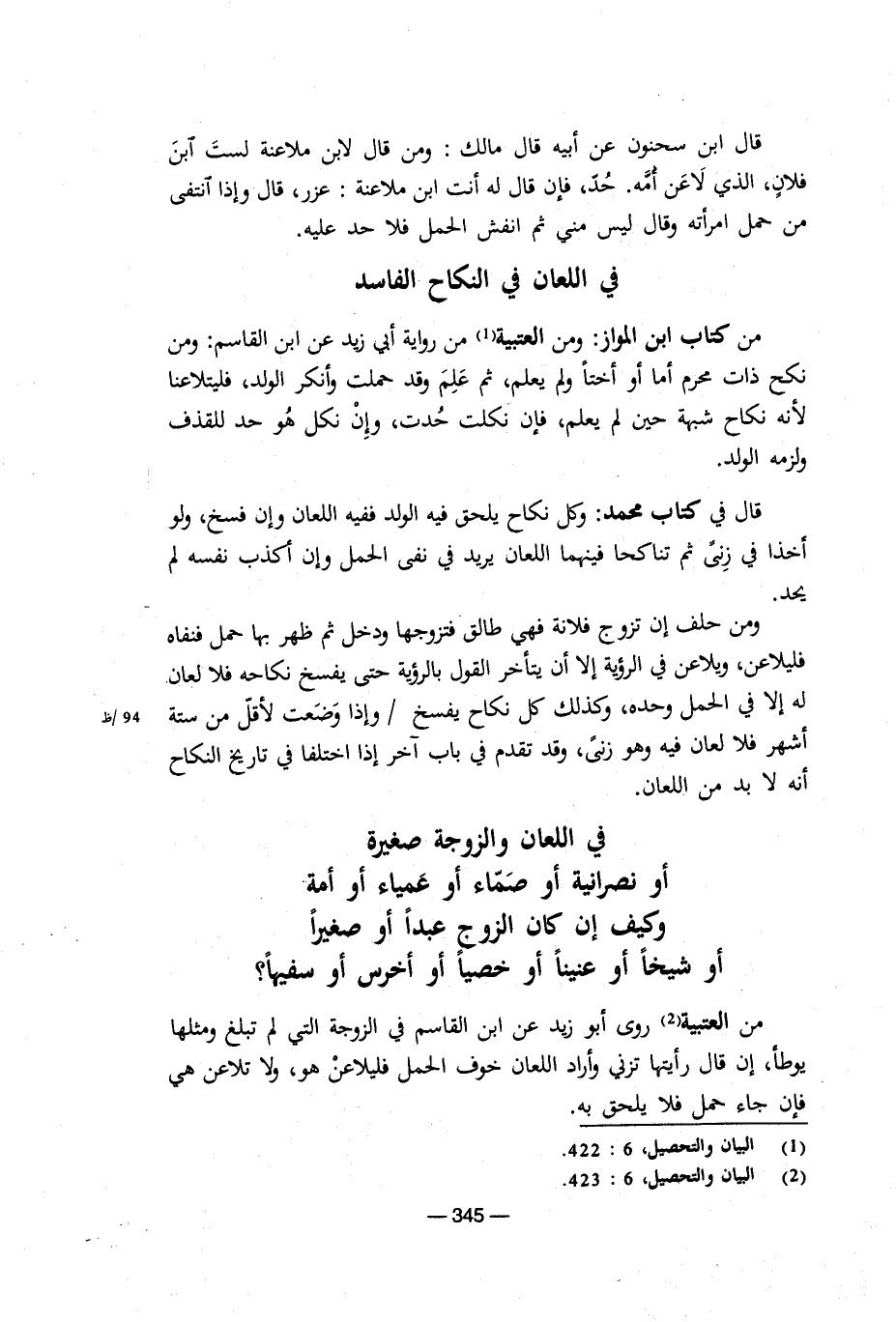 من العتبية روى أبو زيد عن ابن القاسم في الزوجة التى لم تبلغ ومثلها يوطأ، إن قال رأيتها تزني وأراد اللعان خوف الحمل فليلاعن هو، ولا تلاعن هي فإن جاء حمل فلا يلحق به. [5/ 345]