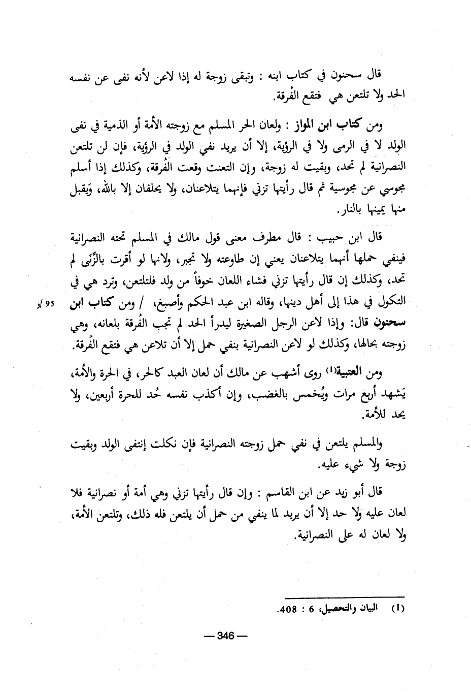 قال ابو زيد عن ابن القاسم: وإن قال رأيتها تزني وهي أمة أو نصرانية فلا لعان عليه ولا حد إلا أن يريد لما ينفي من حمل أن يلتعن فله ذلك، وتلتعن الأمة، ولا لعان له على النصرانية. [5/ 346]