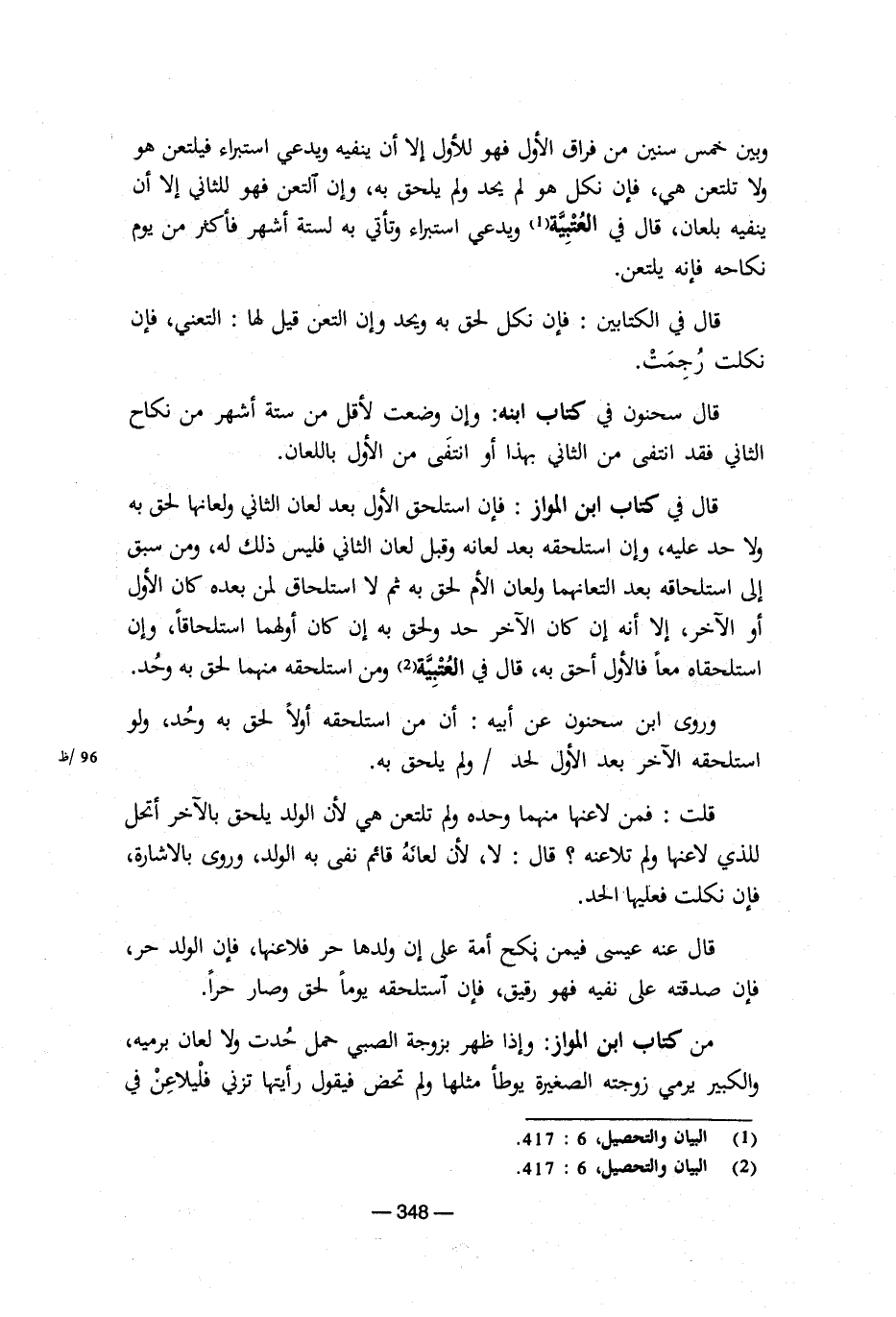 وبين خمس سنين من فراق الأول فهو للأول إلا أن ينفيه ويدعي استبراء فيلتعن هو ولا تلتعن هي، فإن نكل هو لم يحد ولم يلحق به، وإن التعن فهو للثاني إلا أن ينفيه بلعان، قال في العتبية ويدعي استبراء وتأتي به لستة أشهر فأكثر من يوم نكاحه فإنه يلتعن.