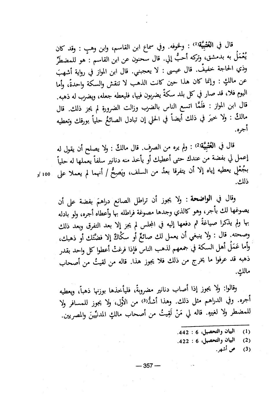 قال في العتبية: ولخوفه وفي سماع ابن القاسم، وابن وهب: وقد كان يعمل به بدمشق، وتركه أحب إلي. قال سحنون عن ابن القاسم: هو للمضطر وذي الحاجة خفيف. قال عيسى: لا يعجبني. قال ابن المواز في رواية أشهب عن مالك: وإنما كان هذا حين كان الذهب لا تنقش والسكة واحدة، وأما اليوم فلا، قد صار في كل بلد سكة يضربون فيها، فليعطه جعله، ويضرب له ذهبه. قال ابن المواز: فلما اتسع الناس بالضرب وزالت الضرورة لم يجز ذلك. قال مالك: ولا خير في ذلك أيضا في الحلي إن تبادل الصائغ حليا بورقك وتعطيه أجره.