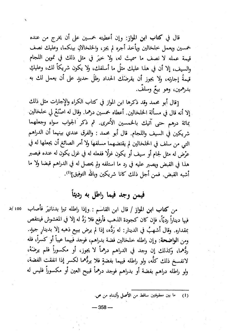 [قال أبو محمد وقد ذكرها ابن المواز في كتاب الكراء والإجارات مثل ذلك إلا أنه قال في مسألة الخلخالين. أعطاه خمسين درهما. وقال له اصنع لي خلخالين بمائة درهم حتى آتيك بالخمسين الأخرى. ثم ذكر الجواب سواء وجعلهما شريكين في السيف واللجام. قال أبو محمد: والفرق عندي بينهما أن الدراهم التي من سلف في الخلخالين لم يقتضهما مسلفها ولا أمر الصائغ أن يجعلها له في عرض له مثل لجام أو سيف أو يكون غزلا ففعله له في غزل يكون له عنده فيصبر هذا في القبض ويصبر عليه في رد ما استلفه ولم يحصل له في الدراهم قبضا ولا ما أشبه القبض. فمن أجل ذلك كانا شريكين وبالله التوفيق].