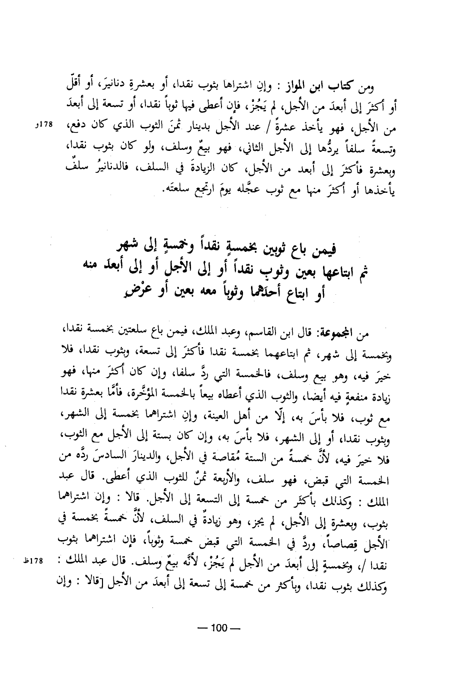 من المجموعة: قال ابن القاسم، وعبد الملك فيمن باع سلعتين بخمسة نقدًا، وبخمسة إلى شهر، ثم ابتاعهما بخمسة نقدًا فأكثر إلى تسعة، وبثوب نقدًا، فلا خير فيه، وهو بيع وسلف، فالخمسة التي رد سلفًا، وإن كان أكثر منها، فهو زيادة منفعة فيه أيضًا، والثوب الذي أعطاه بيعًا بالخمسة المؤخرة، فأما بعشرة نقدًا مع ثوب، فلا بأس به، إلا من أهل العينة، وإن اشتراهما بخمسة إلى الشهر، وبثوب نقدًا، أو إلى الشهر، فلا بأس به، وإن كان بستة إلى الأجل مع الثوب، فلا خير فيه؛ لأن خمسة من الستة مقاصة في الأجل، والدينار السادس رده من الخمسة التي قبض، فهو سلف، والأربعة ثمن للثوب الذي أعطى. قال عبد الملك: وكذلك بأكثر من خمسة إلى التسعة إلى الأجل. قالا: وإن اشتراهما بثوب، وبعشرة إلى الأجل، لم يجز، وهو زيادة في السلف؛ لأن خمسة بخمسة في الأجل قصاصًا، ورد في الخمسة التي قبض خمسة وثوبًا، فإن اشتراهما بثوب نقدًا، وبخمسة إلى أبعد من الأجل لم يجز؛ لأنه بيع وسلف. قال عبد الملك: وكذلك بثوب نقدًا، وبأكثر من خمسة إلى تسعة إلى أبعد من الأجل. قالا: وإن