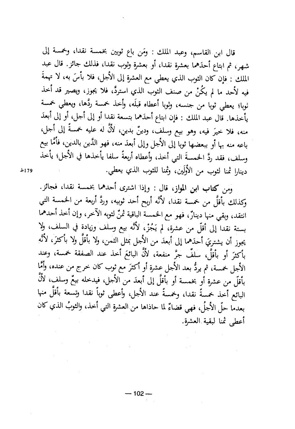 ومن كتاب ابن المواز، قال: وإذا اشترى أحدهما بخمسة نقدًا، فجائز. وكذلك بأقل من خمسة نقدًا؛ لأنه أربح أحد ثوبيه، ورد أربعة من الخمسة التي انتقد، وبقي منها دينار، فهو مع الخمسة الباقية ثمن لثوبه الآخر، وإن أخذ أحدهما بستة نقدًا إلى أقل من عشرة، لم يجز؛ لأنه بيع وسلف وزيادة في السلف، ولا يجوز أن يشتري أحدهما إلى أبعد من الأجل بمثل الثمن، ولا بأقل ولا بأكثر؛ لأنه بأكثر أو بأقل، سلف جر منفعة؛ لأن البائع أخذ عند الصفقة خمسة، وعند الأجل خمسة، ثم يرد بعد الأجل عشرة أو أكثر مع ثوب كان خرج من عنده، وأما بأقل من عشرة أو بخمسة أو بأقل إلى أبعد من الأجل، فيدخله بيع وسلف، لأن البائع أخذ خمسة نقدًا، وخمسة عند الأجل، وأعطى ثوبًا نقدًا وتسعة بأقل منها بعدما حل الأجل، فهي قضاء لما حاذاها من العشرة التي أخذ، والثوب الذي كان أعطى ثمنًا لبقية العشرة.