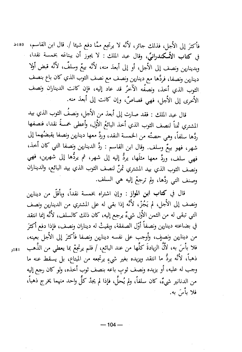 فأكثر إلى الأجل، فذلك جائز؛ لأنه لا يرتجع مما دفع شيئًا. قال ابن القاسم في كتاب الأسكندراني، وقال عبد الملك: لا يجوز أن يبتاعه بخمسة نقدًا، وبدينارين ونصف إلى الأجل، أو إلى أبعد منه؛ لأنه بيع وسلف؛ لأنه قبض أولا دينارين ونصفًا، فردها مع دينارين ونصف مع نصف الثوب الذي كان باع بنصف الثوب الذي أخذ، ونصفه الآخر قد عاد إليه، فإن كانت الديناران ونصف الأخرى إلى الأجل، فهي قصاص، وإن كانت إلى أبعد منه.