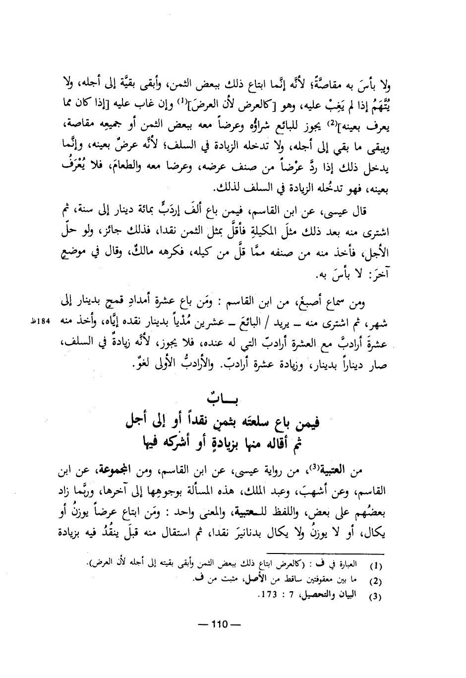 من العتبية من رواية عيسى عن ابن القاسم، ومن المجموعة عن ابن القاسم، وعن أشهب، وعبد الملك، هذه المسألة بوجوهها إلى آخرها، وربما زاد بعضهم على بعض، واللفظ للعتبية، والمعنى واحد: ومن ابتاع عرضًا يوزن أو يكال، أو لا يوزن ولا يكال بدنانير نقدًا، ثم استقال منه قبل ينقد فيه بزيادة