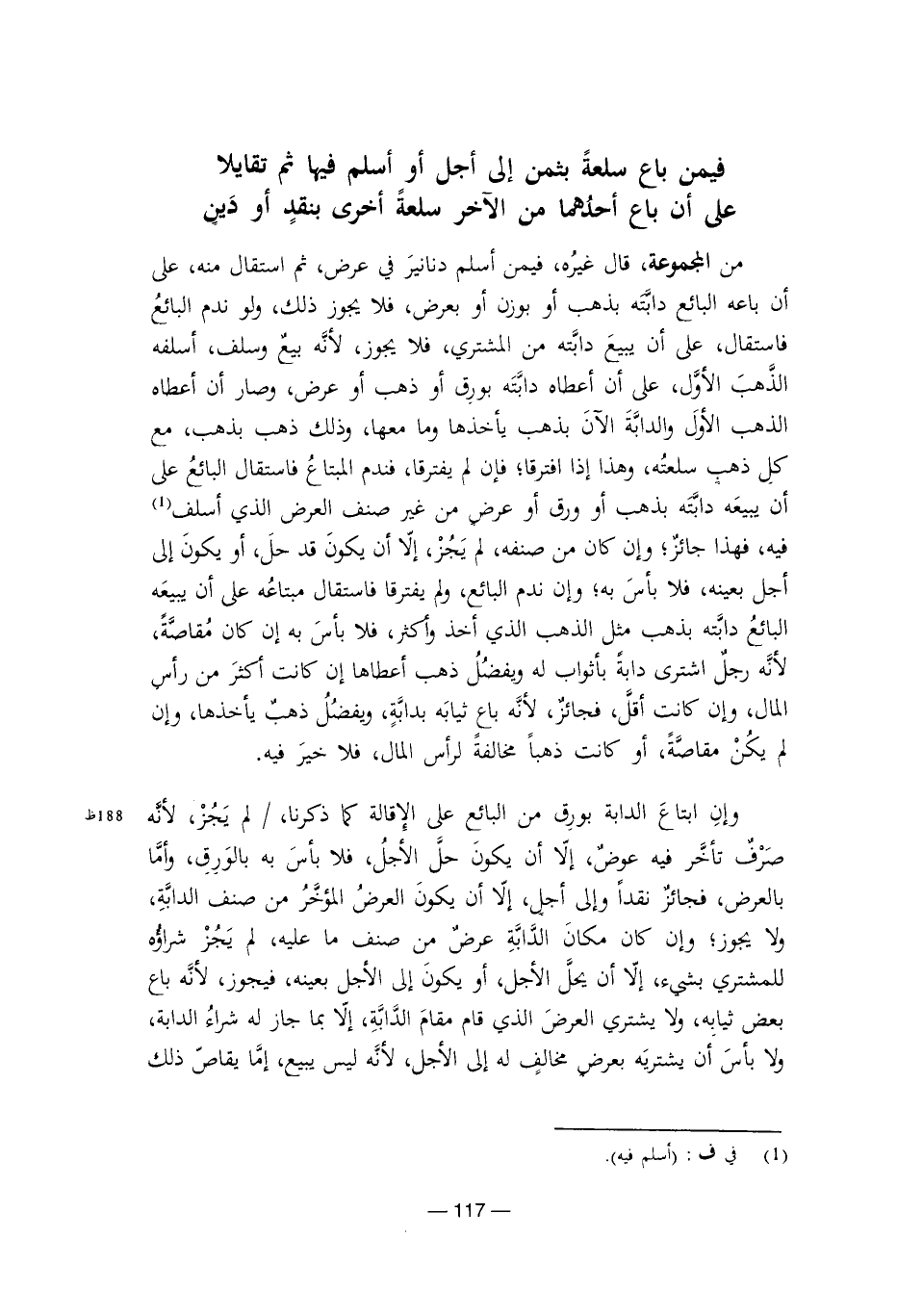 وإن ابتاع الدابة بورق من البائع على الإقالة كما ذكرنا، لم يجز؛ لأنه صرف تأخر فيه عوض، إلا أن يكون حل الأجل، فلا بأس به بالورق، وأما بالعرض، فجائز نقدًا وإلى أجل، إلا أن يكون العرض المؤخر من صنف الدابة، ولا يجوز، وإن كان مكان الدابة عرض من صنف ما عليه، لم يجز شراؤه للمشتري بشيء، إلا أن يحل الأجل، أو يكون إلى الأجل بعينه، فيجوز؛ لأنه باع بعض ثيابه، ولا يشتري العرض الذي قام مقام الدابة، إلا بما جاز له شراء الدابة، ولا بأس أن يشتريه بعرض مخالف له إلى الأجل؛ لأنه ليس يبيع، إما يقاص ذلك