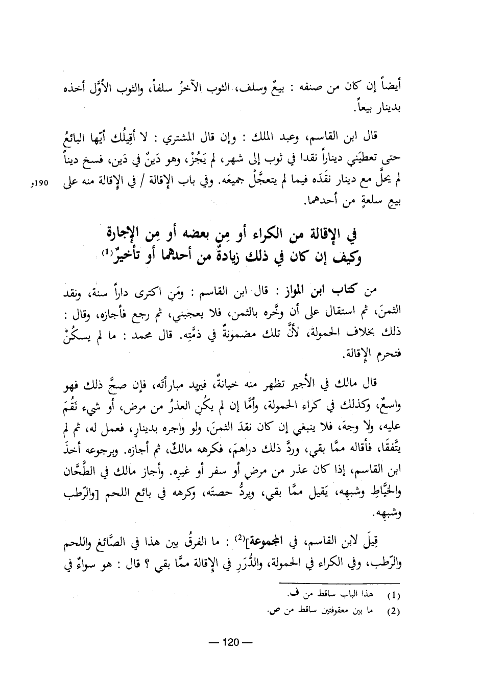 قيل لابن القاسم في المجموعة: ما الفرق بين هذا في الصائغ واللحم والرطب، وفي الكراء في الحمولة، والدرر في الإقالة مما بقي؟ قال: هو سواء في